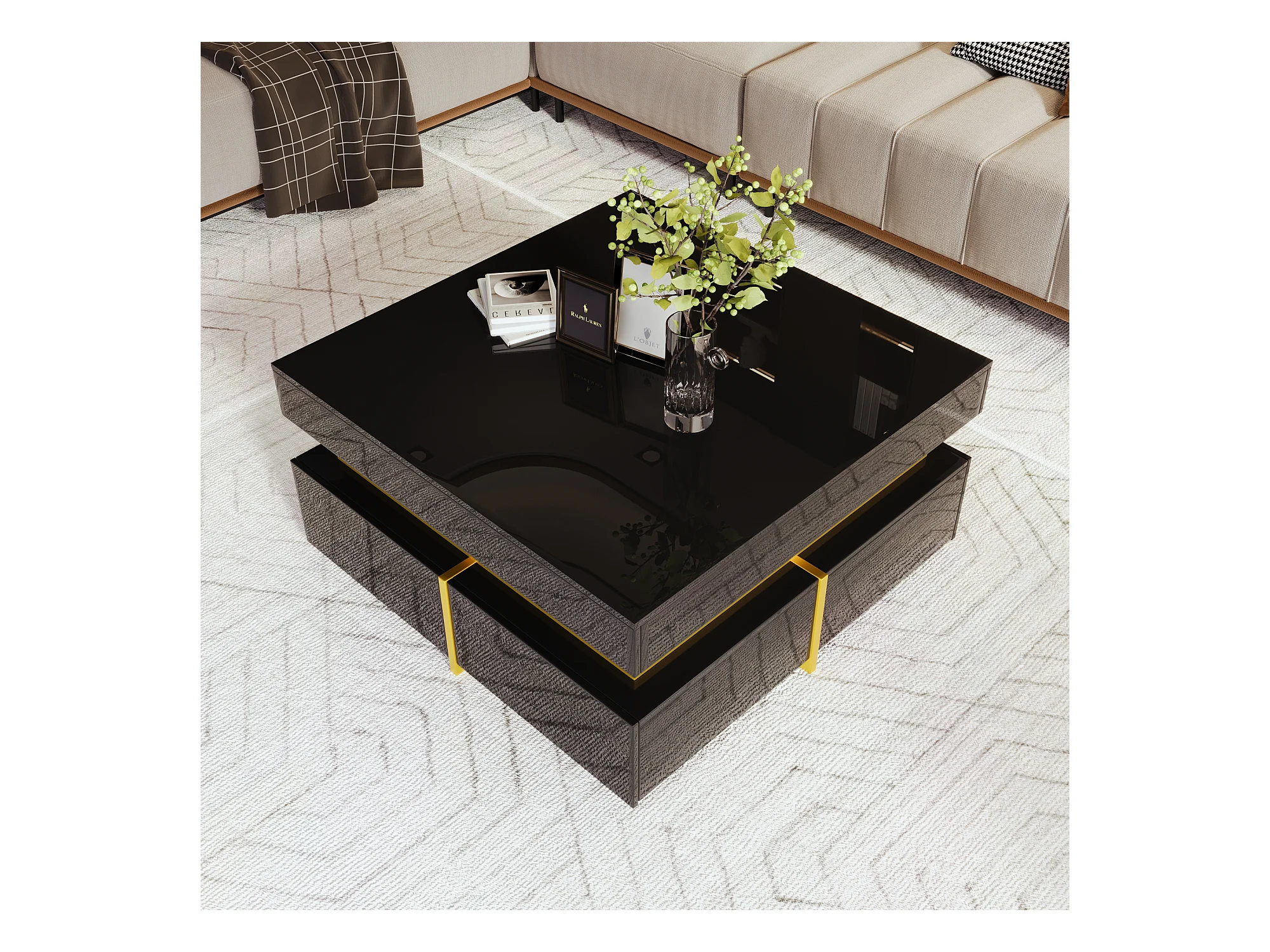 Couchtisch, Hochglanz-Wohnzimmertisch, Beistelltisch mit Schubladen und goldenen Akzenten