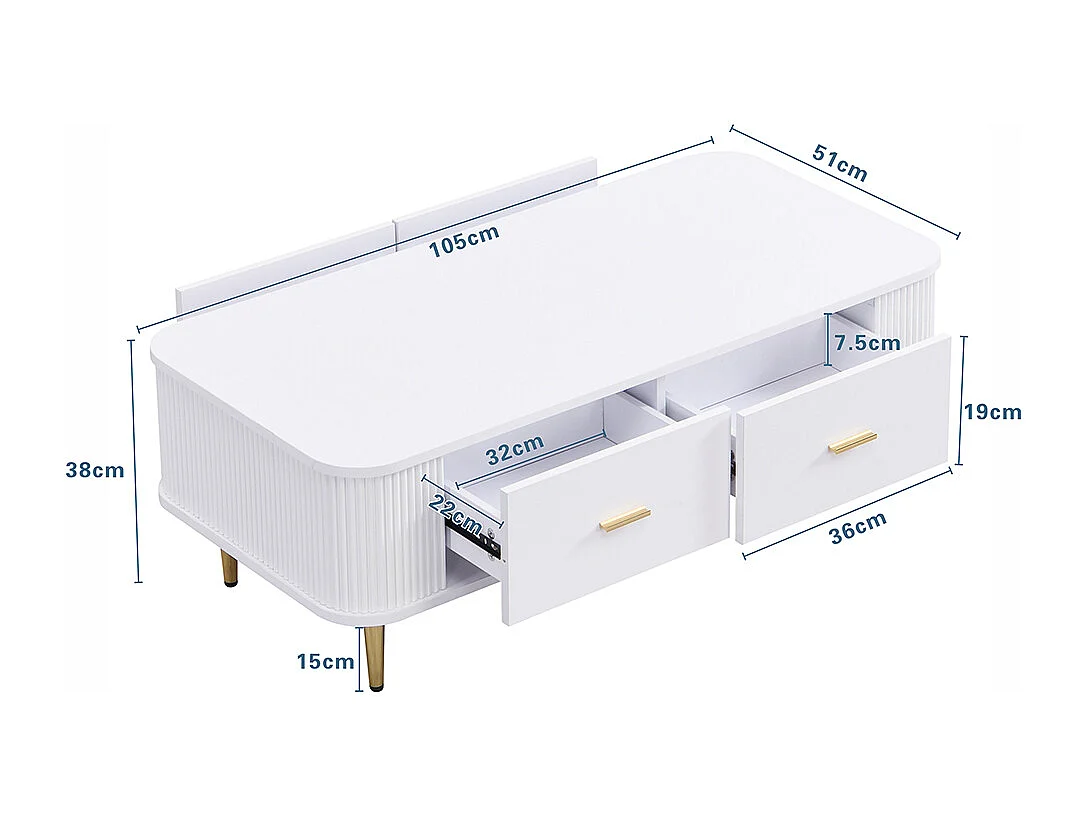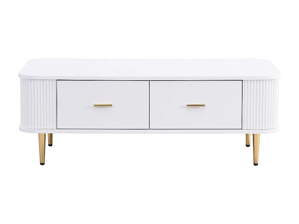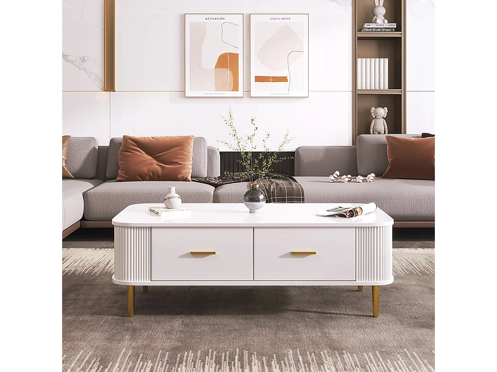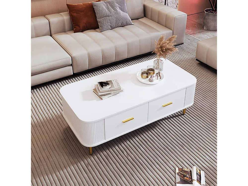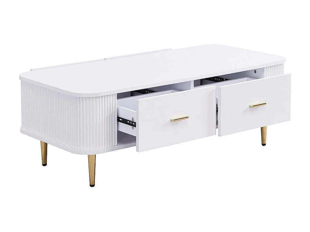 Couchtisch mit Schubladen, geschwungene Ecken, Wohnzimmertisch mit gewellten Seiten, goldenen Griffen und Füßen, Beistelltisch