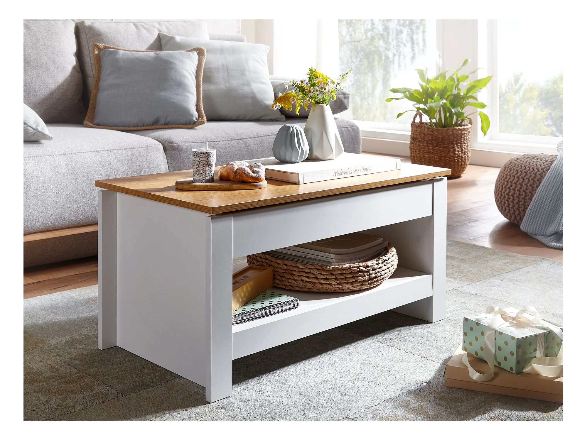 Couchtisch Wohnzimmertisch Weiß 85x47x42cm Sofatisch Tisch mit Stauraum