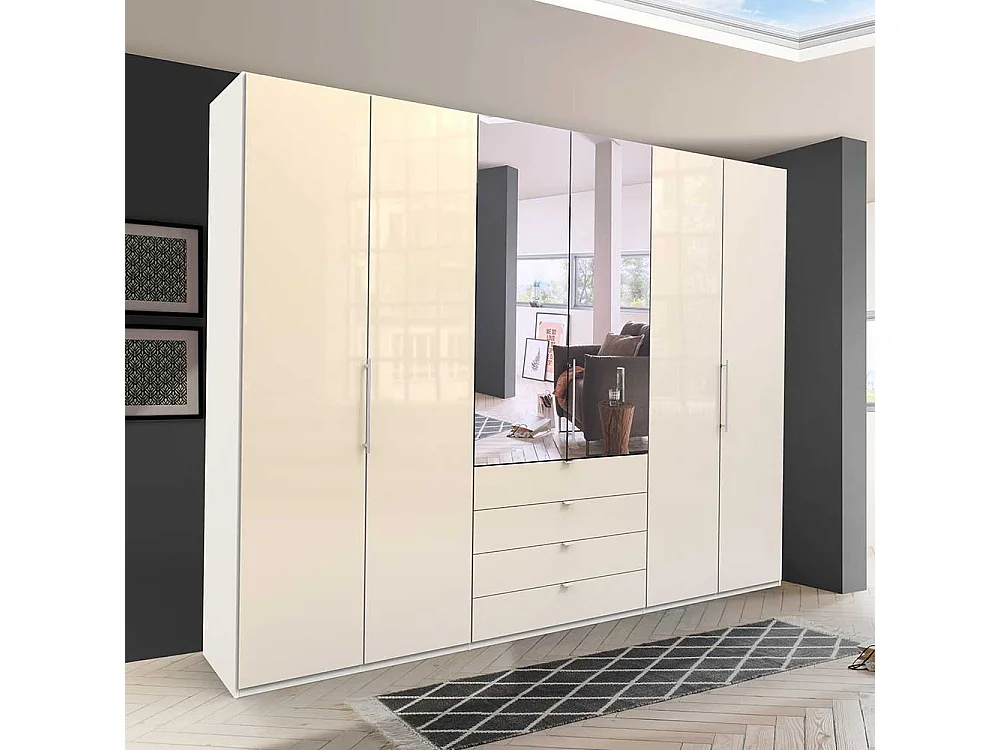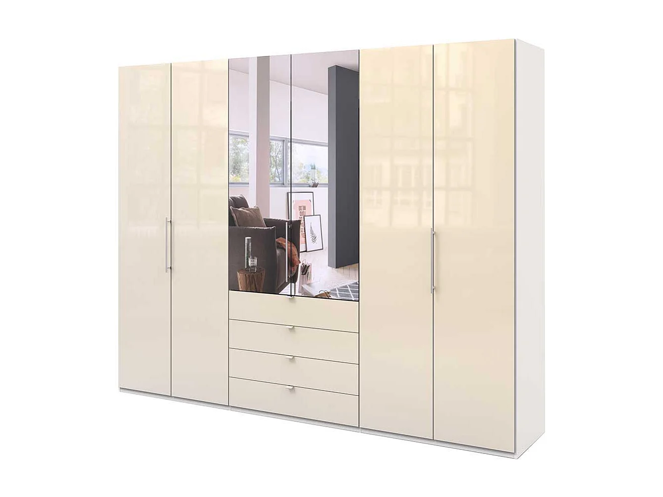 Cremefarbener Kleiderschrank mit Spiegel Falttüren und Schubladen