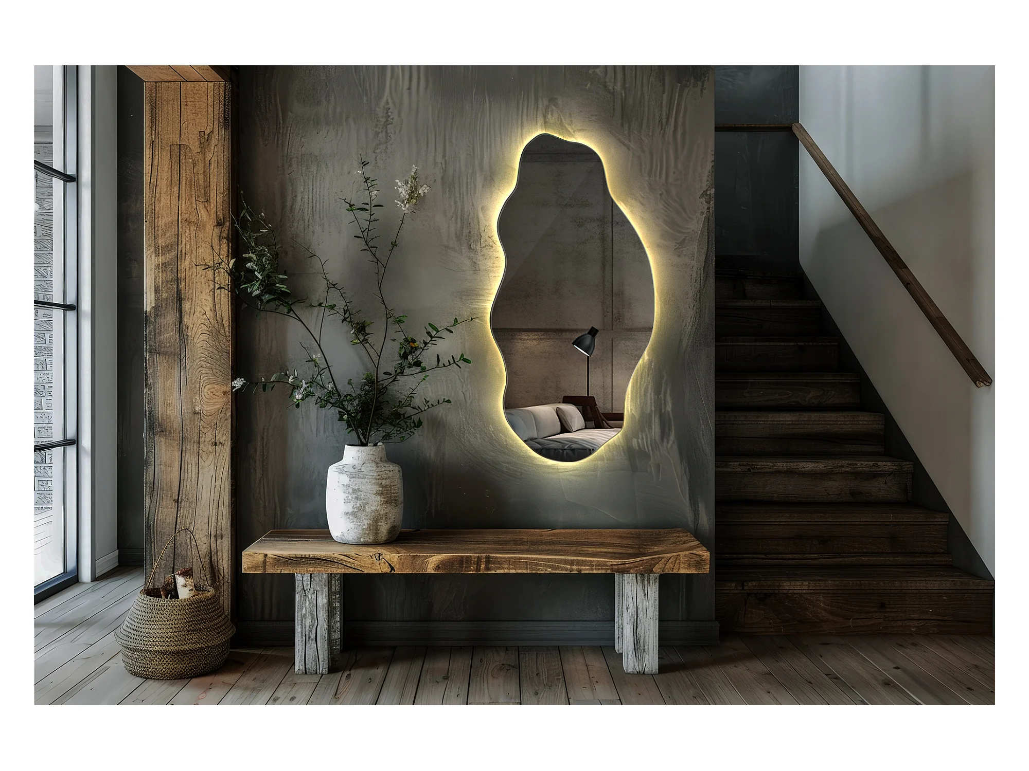 Dekorativer hängender Wandspiegel mit LED-Beleuchtung, unregelmäßige Form, 40 cm x 80 cm – warmes Licht