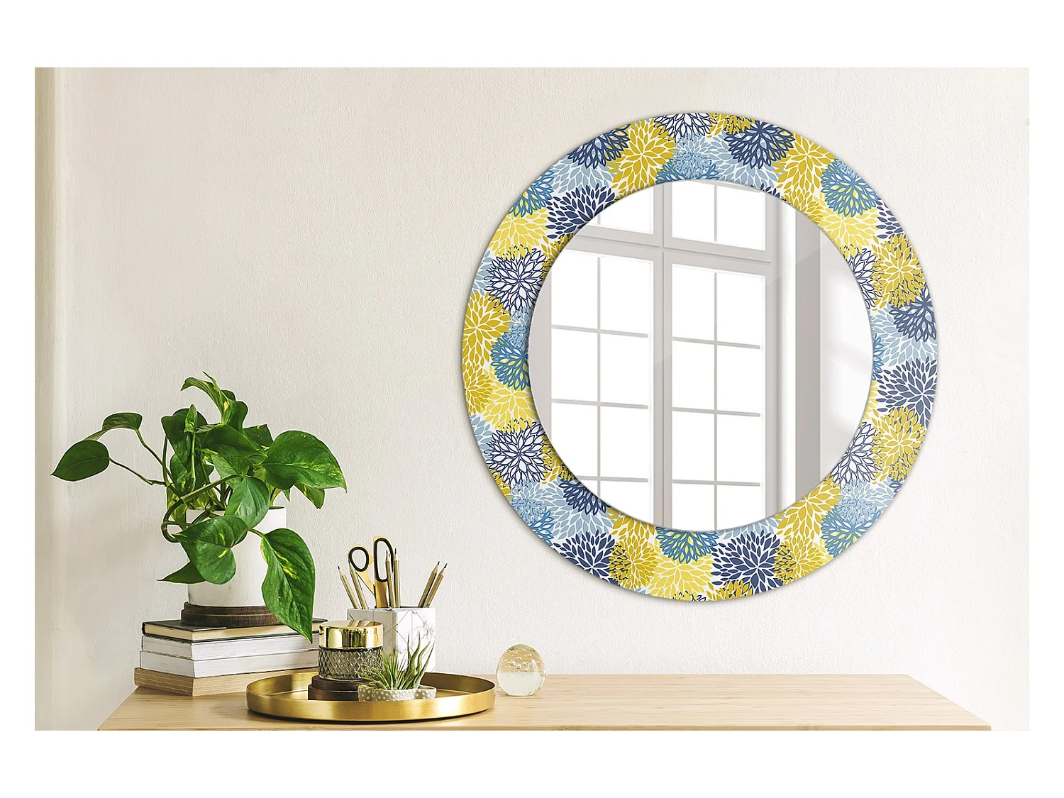 Dekorativer runder Spiegel - Blaue Blumen - 50 cm