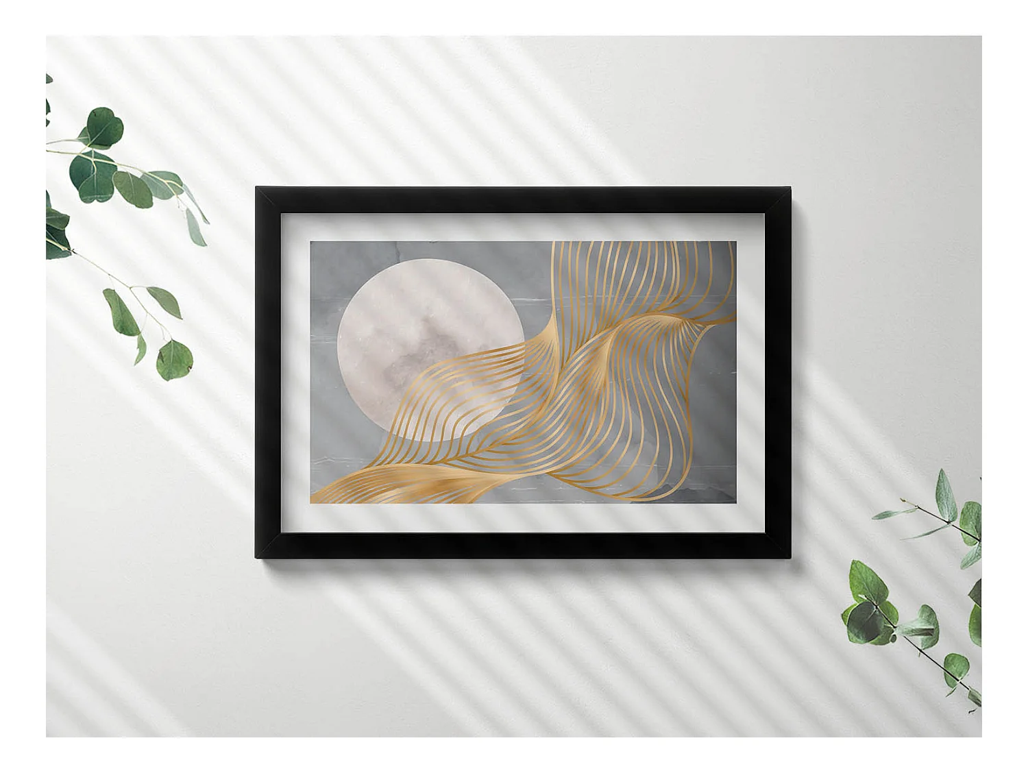 Dekoratives Gemälde mit schwarzem Rahmen, abstrakte Illustration des Mondes mit Gold 30 x 20 cm – perfekt für das Wohn- oder Schlafzimmer