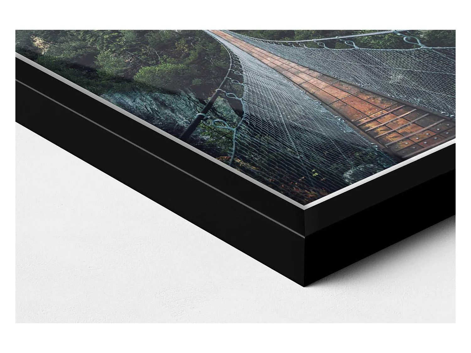 Dekoratives Gemälde mit schwarzem Rahmen, Hängebrücke über den Wald 20 x 30 cm – Perfekt für das Wohn- oder Schlafzimmer