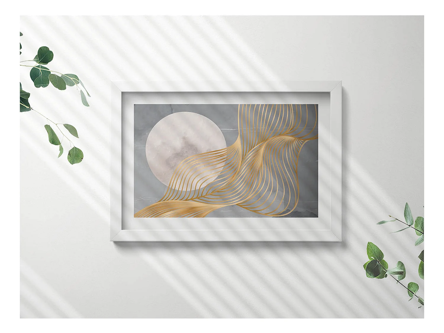 Dekoratives Gemälde mit weißem Rahmen, abstrakte Illustration des Mondes mit Gold 30 x 20 cm – perfekt für das Wohn- oder Schlafzimmer