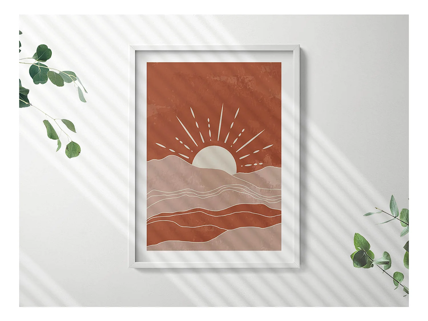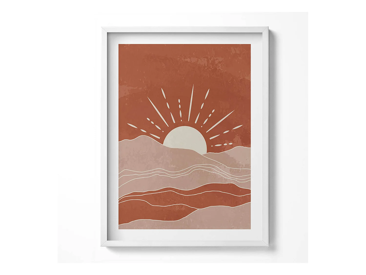 Dekoratives Gemälde mit weißem Rahmen, Illustration der aufgehenden Sonne 60 x 80 cm – Perfekt für das Wohn- oder Schlafzimmer