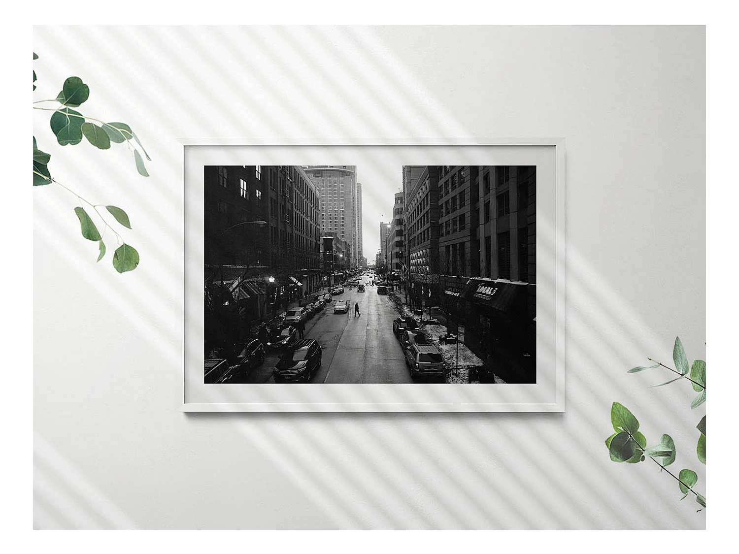 Dekoratives Gemälde mit weißem Rahmen, Schwarz-weiße Straßen von Chicago 100 x 70 cm – Perfekt für das Wohn- oder Schlafzimmer
