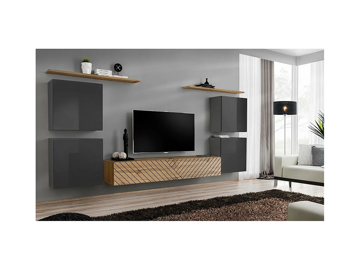 Designermöbel-Set für das Wohnzimmer SWITCH IV. Farben Grau und Eiche. Oberflächen in glänzendem Grau und gefräster Eiche.