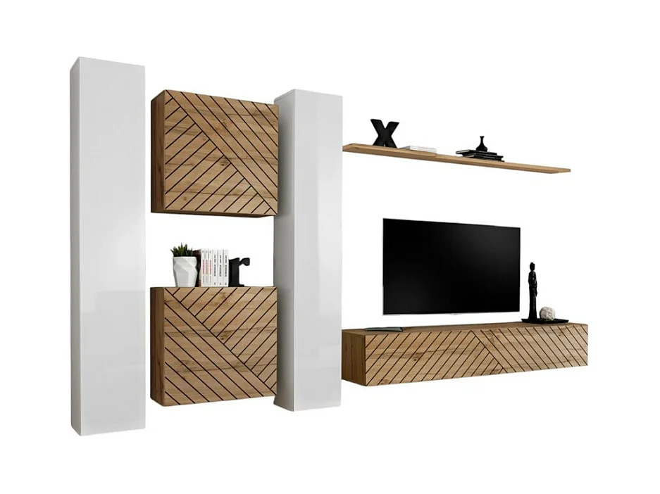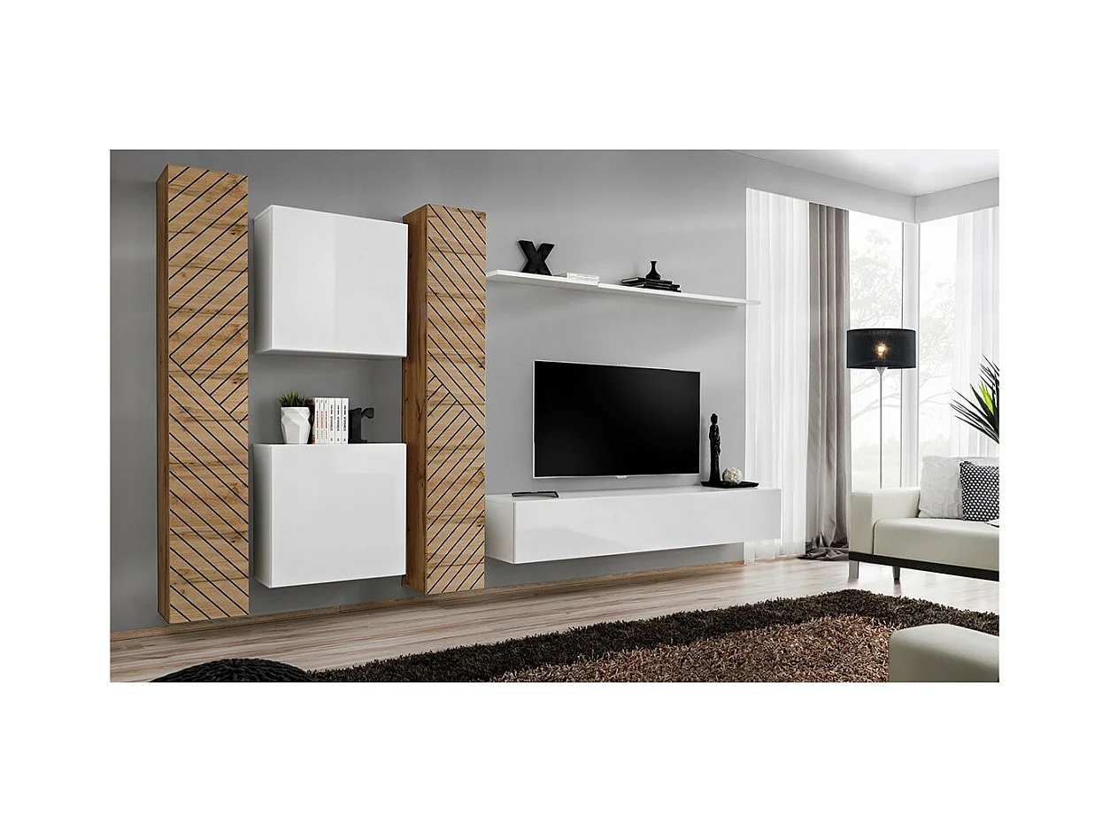 Designermöbel-Set für das Wohnzimmer SWITCH VI, Eiche/Weiß, Eichenfinish mit Fräseffekt und glänzendem Weiß