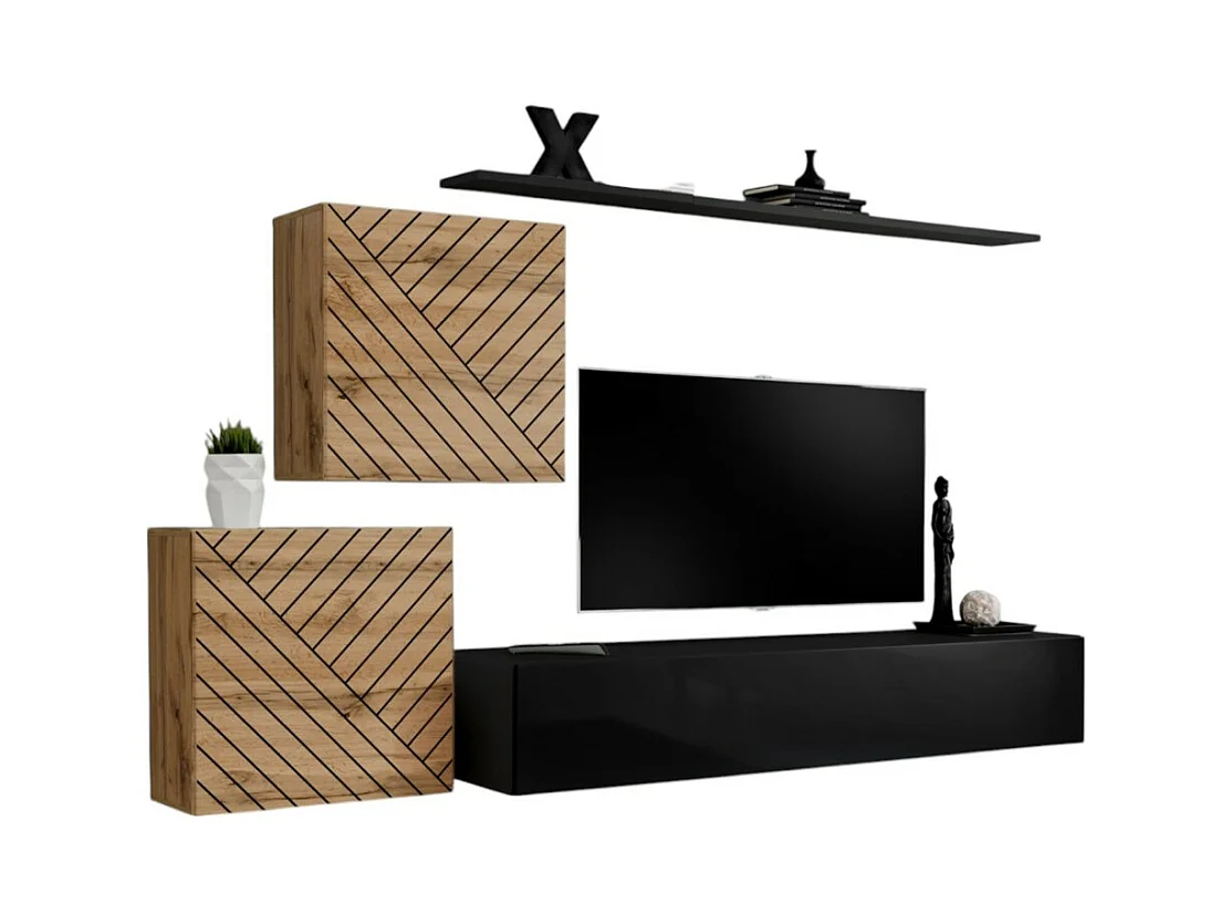 Designermöbelset für das Wohnzimmer SWITCH V, Eiche/Schwarz, Oberflächen in gefräster Eiche und Hochglanz Schwarz