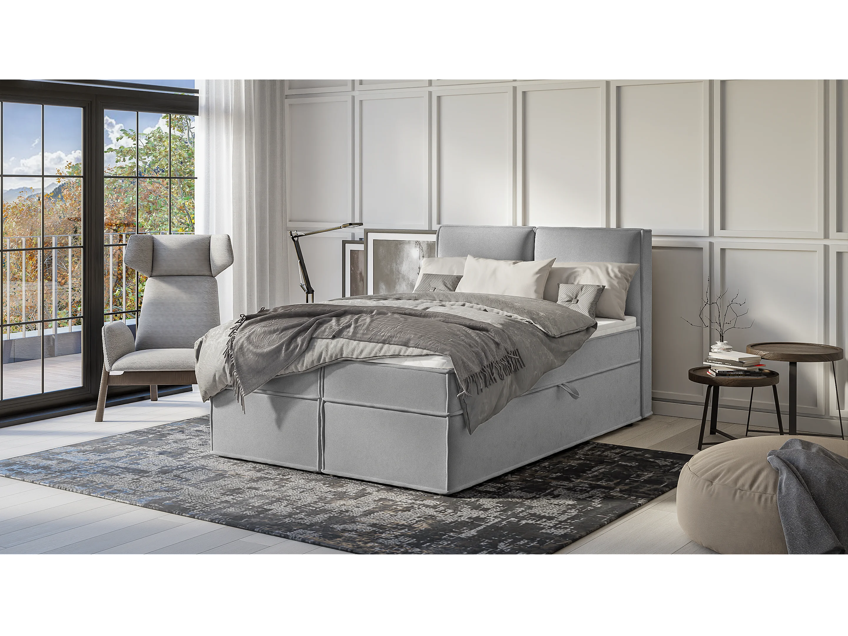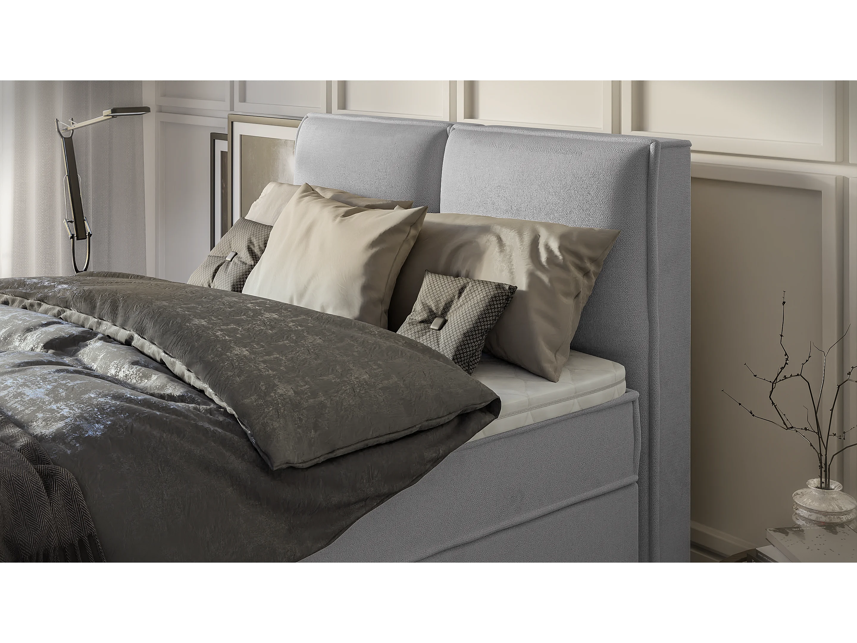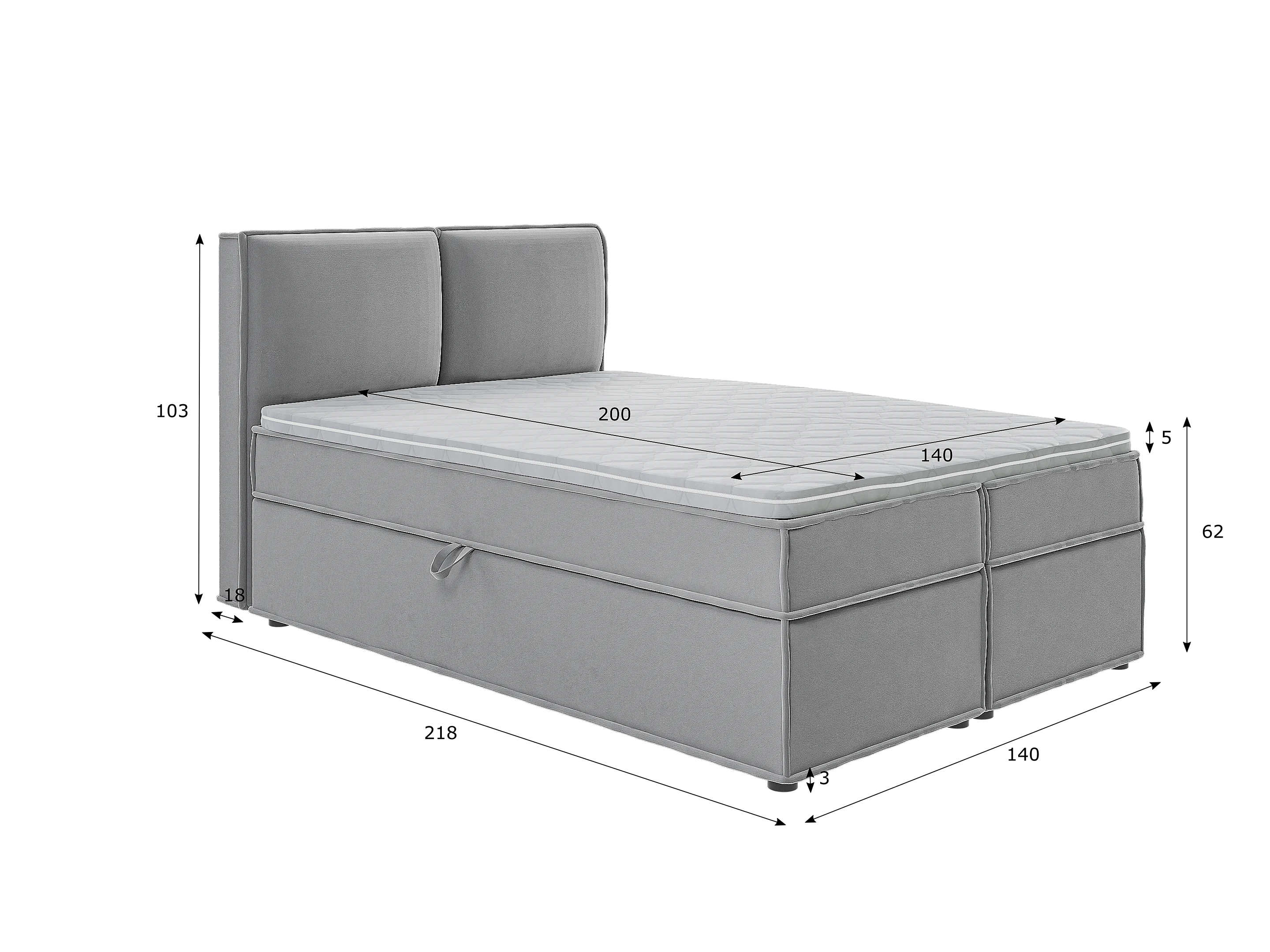 Dexter - Modernes Boxspringbett 140x200 mit Topper und Bettkästen aus Grau Luxusmicrofaser