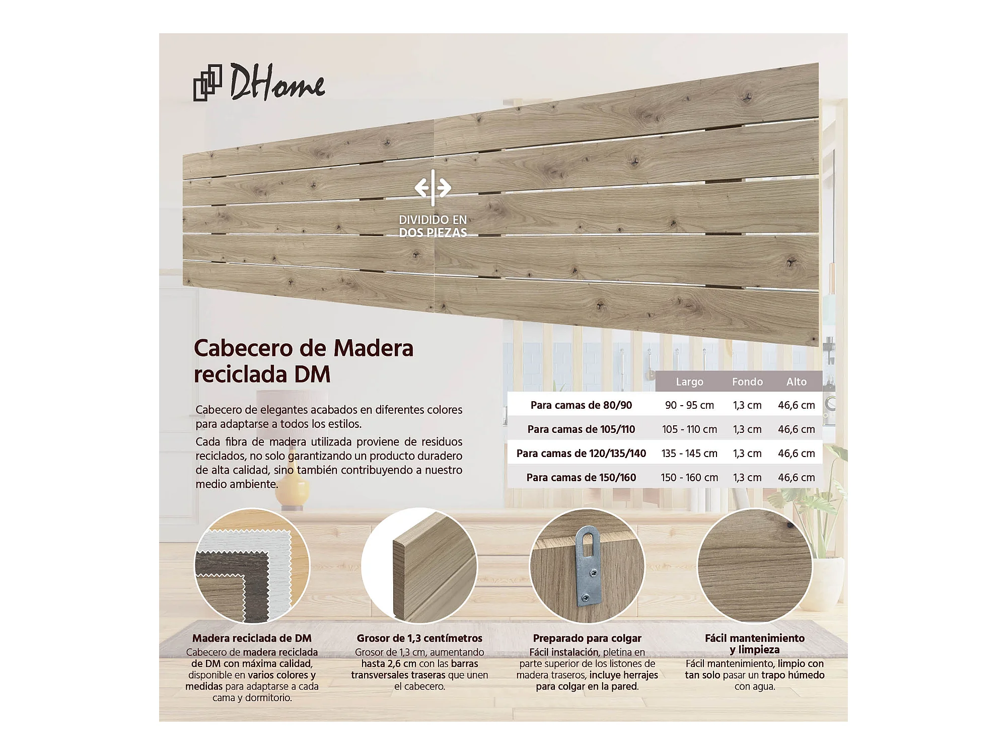 DHOME DM-Kopfteil aus recyceltem Holz, doppelter horizontaler Palettenstil, unterteilt in 2 Teile, 180 x 46 cm, Betten 180 – Eiche