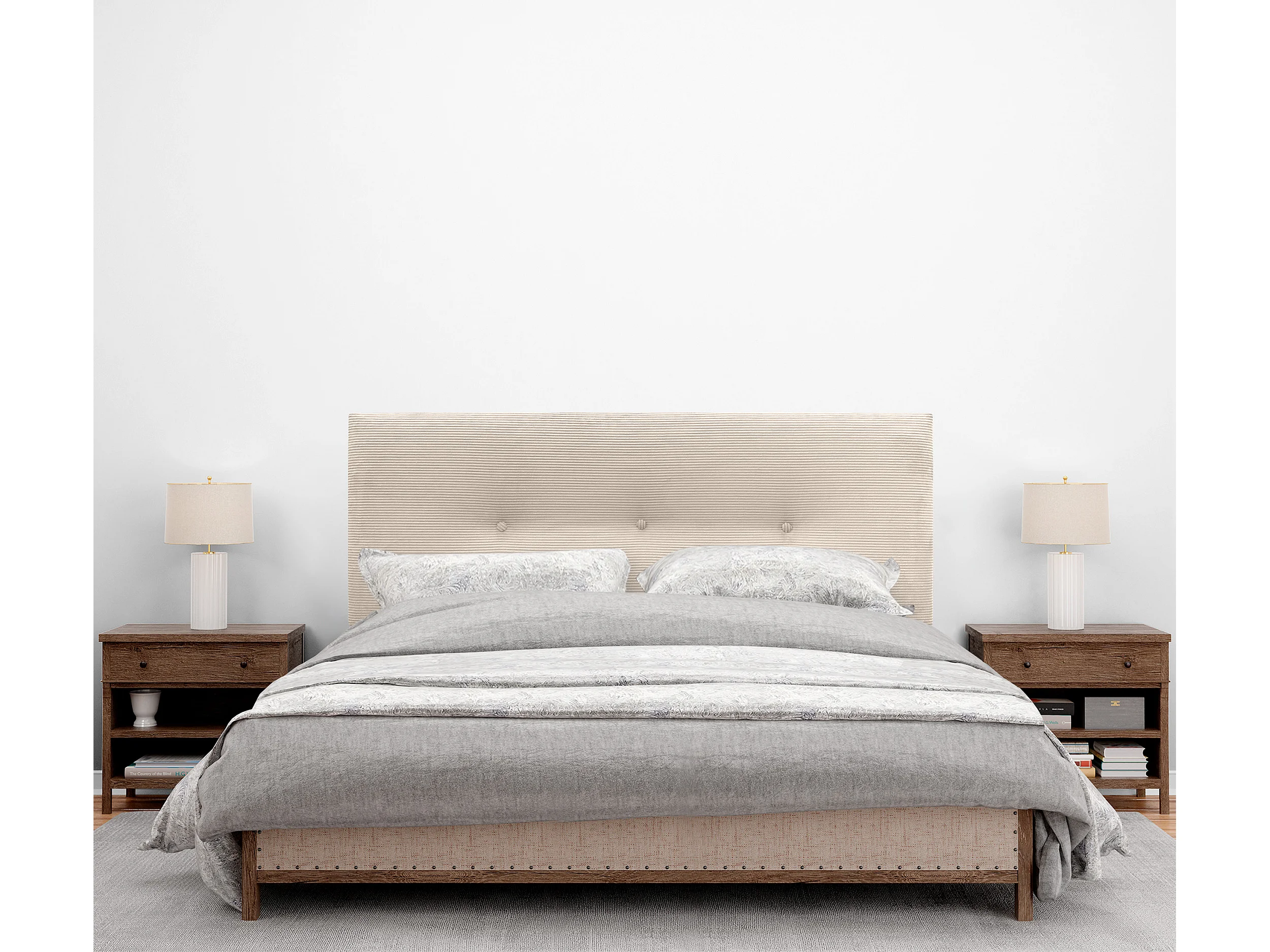 DHOME Einfarbiges Cord-Kopfteil mit Knöpfen 150x115 mit Bettbeinen 150/160 – Beige