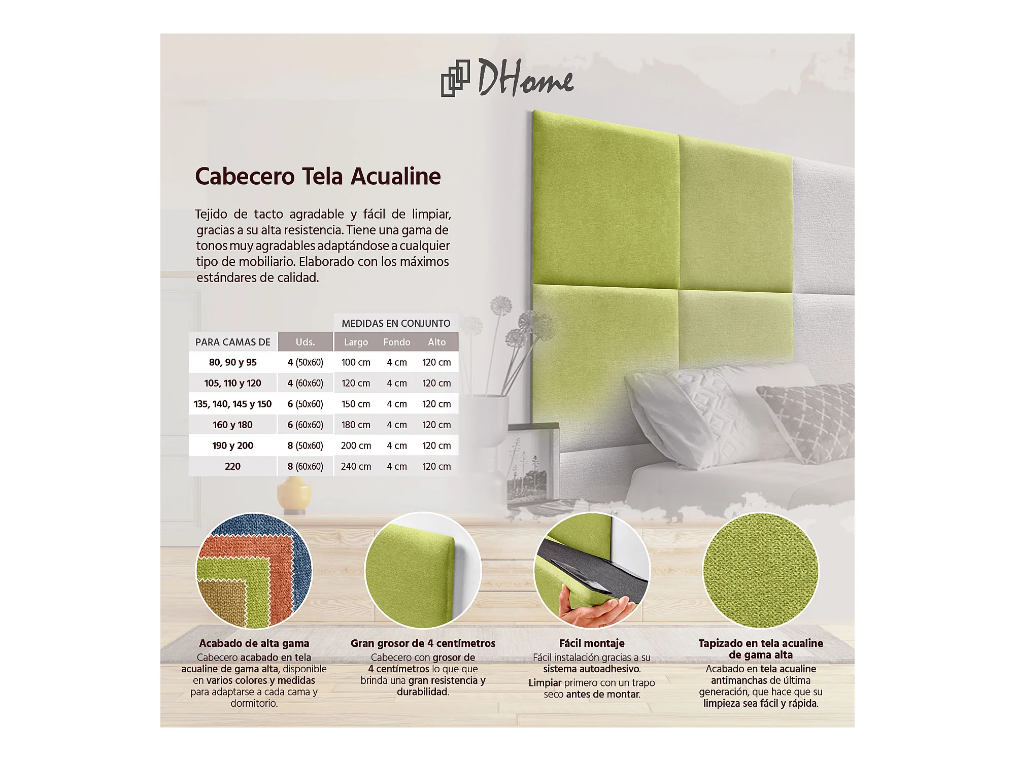DHOME Gepolstertes Kopfteil aus Acualine-Stoff, aus selbstklebenden, austauschbaren Bettpaneelen, luxuriös gepolstertes Schlafzimmer (Pistazie, 220 cm)