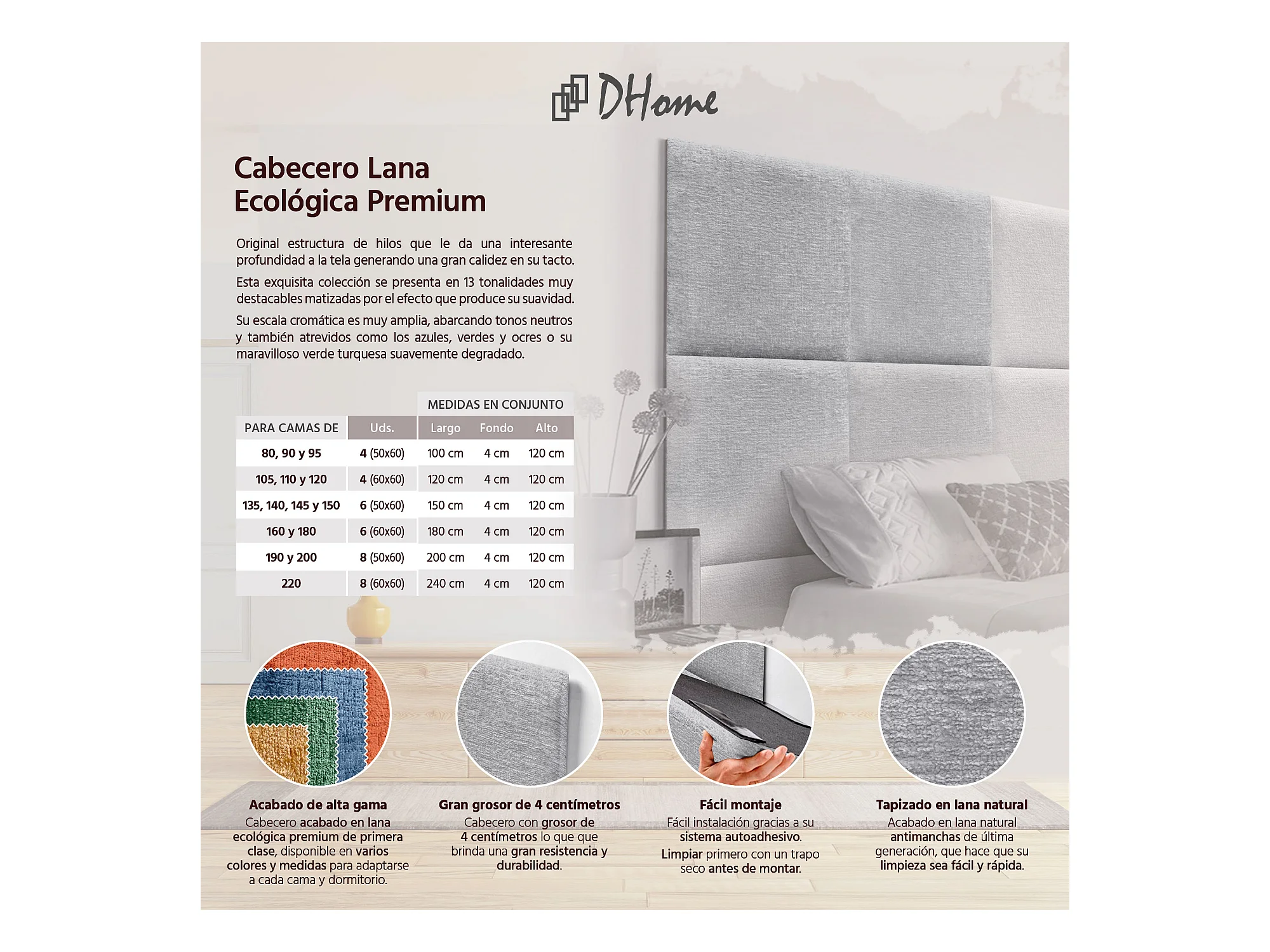 DHOME Gepolstertes Kopfteil aus ökologischer Wolle, bestehend aus austauschbaren selbstklebenden Paneelen, luxuriöses gepolstertes Schlafzimmer (Hellgrau, 150cm)