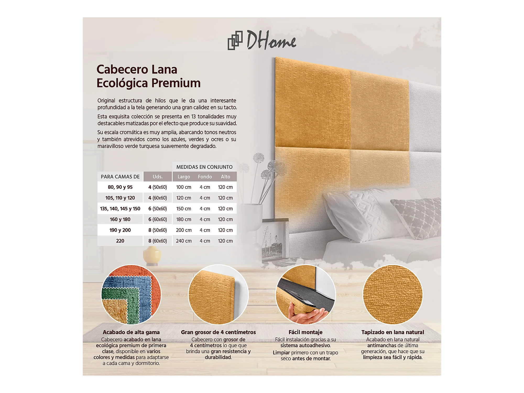 DHOME Gepolstertes Kopfteil aus ökologischer Wolle, bestehend aus austauschbaren selbstklebenden Paneelen, luxuriöses gepolstertes Schlafzimmer (Senf, 140cm)
