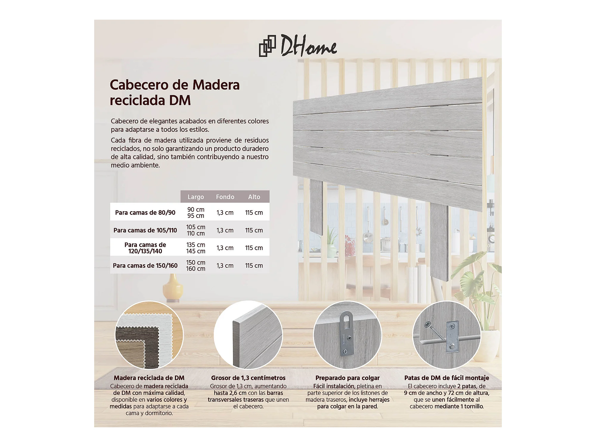 DHOME Kopfteil aus recyceltem Holz, Dm, horizontal, Palettenstil mit Beinen, 105 x 115 cm, Betten 105 – Arktis