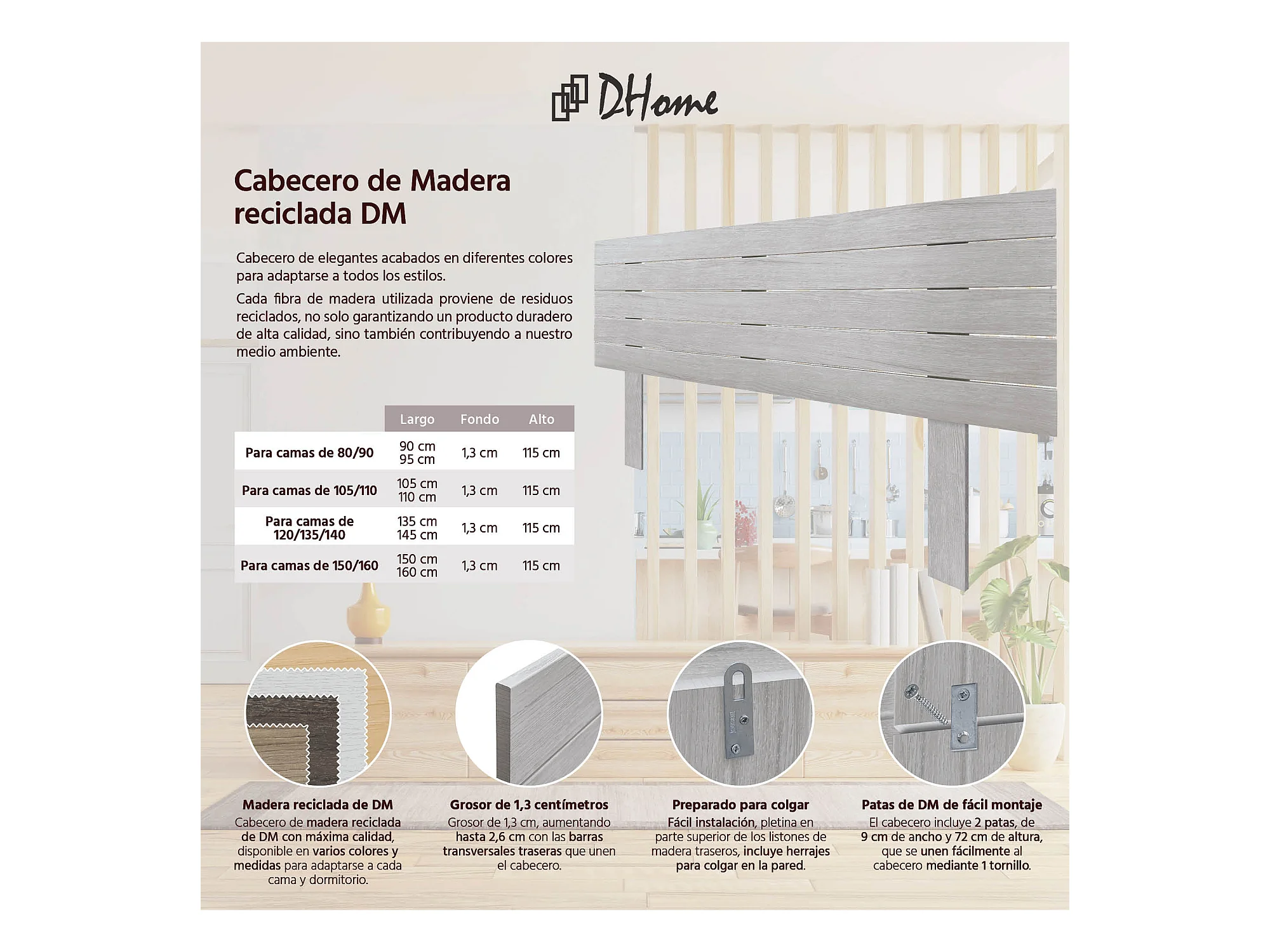 DHOME Kopfteil aus recyceltem Holz, Dm, horizontal, Palettenstil mit Beinen, 150 x 115 cm, Betten 150 – Arktis