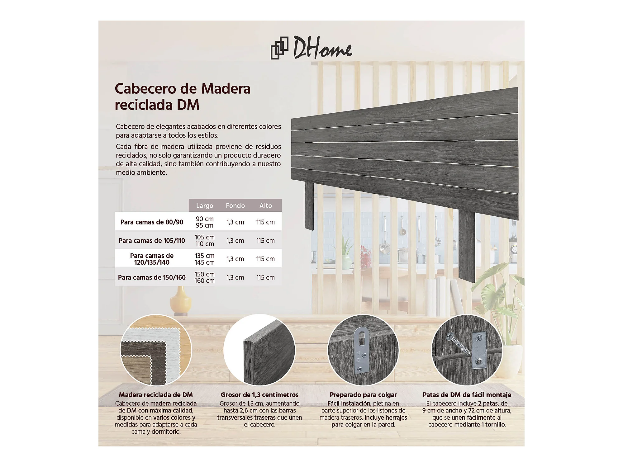 DHOME Kopfteil aus recyceltem Holz, Dm, horizontal, Palettenstil mit Beinen, 160 x 115 cm, Betten 160 – Holzasche
