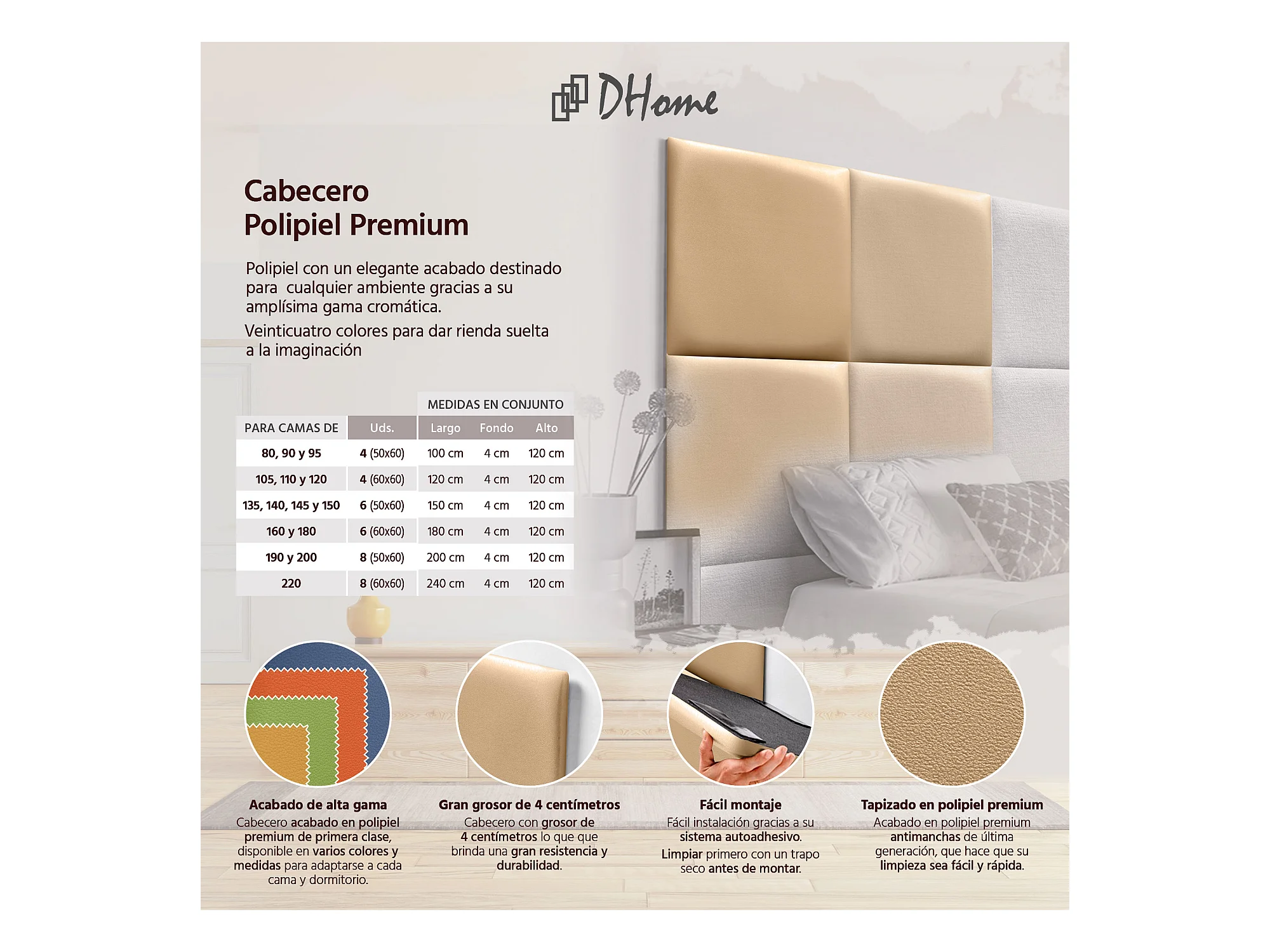 DHOME Premium-Kopfteil mit Kunstlederbezug, aus austauschbaren, selbstklebenden Paneelen, luxuriös gepolstertes Schlafzimmer (Champagner, 140 cm)