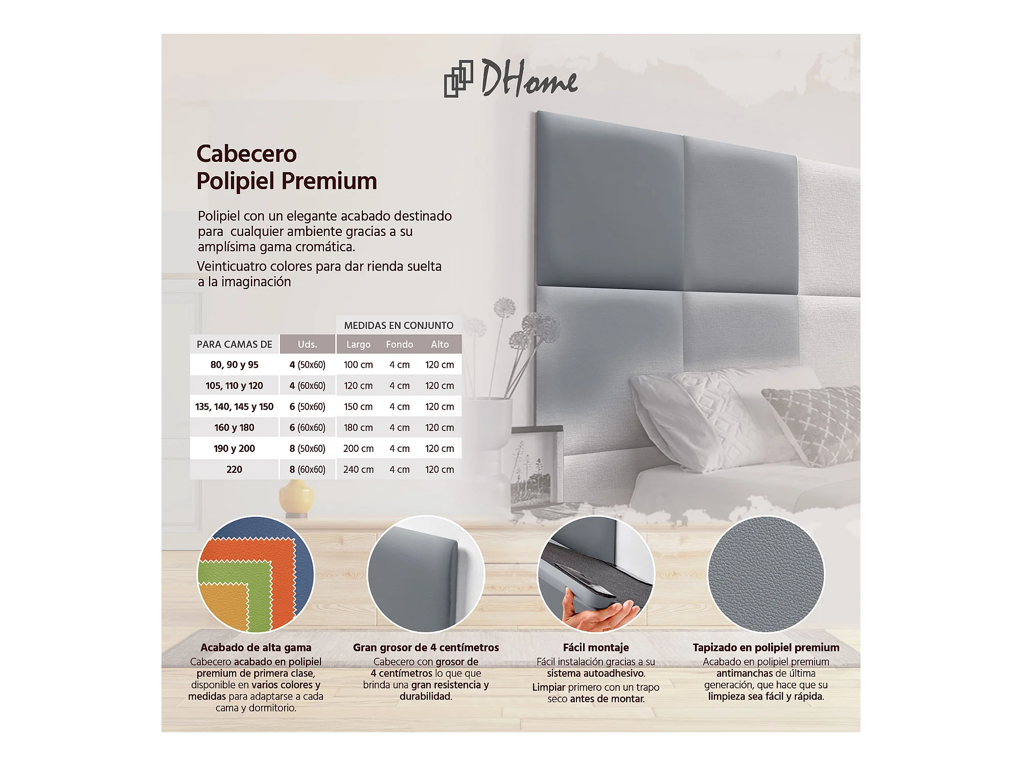 DHOME Premium-Kopfteil mit Kunstlederbezug, aus austauschbaren, selbstklebenden Paneelen, luxuriös gepolstertes Schlafzimmer (grau, 110 cm)