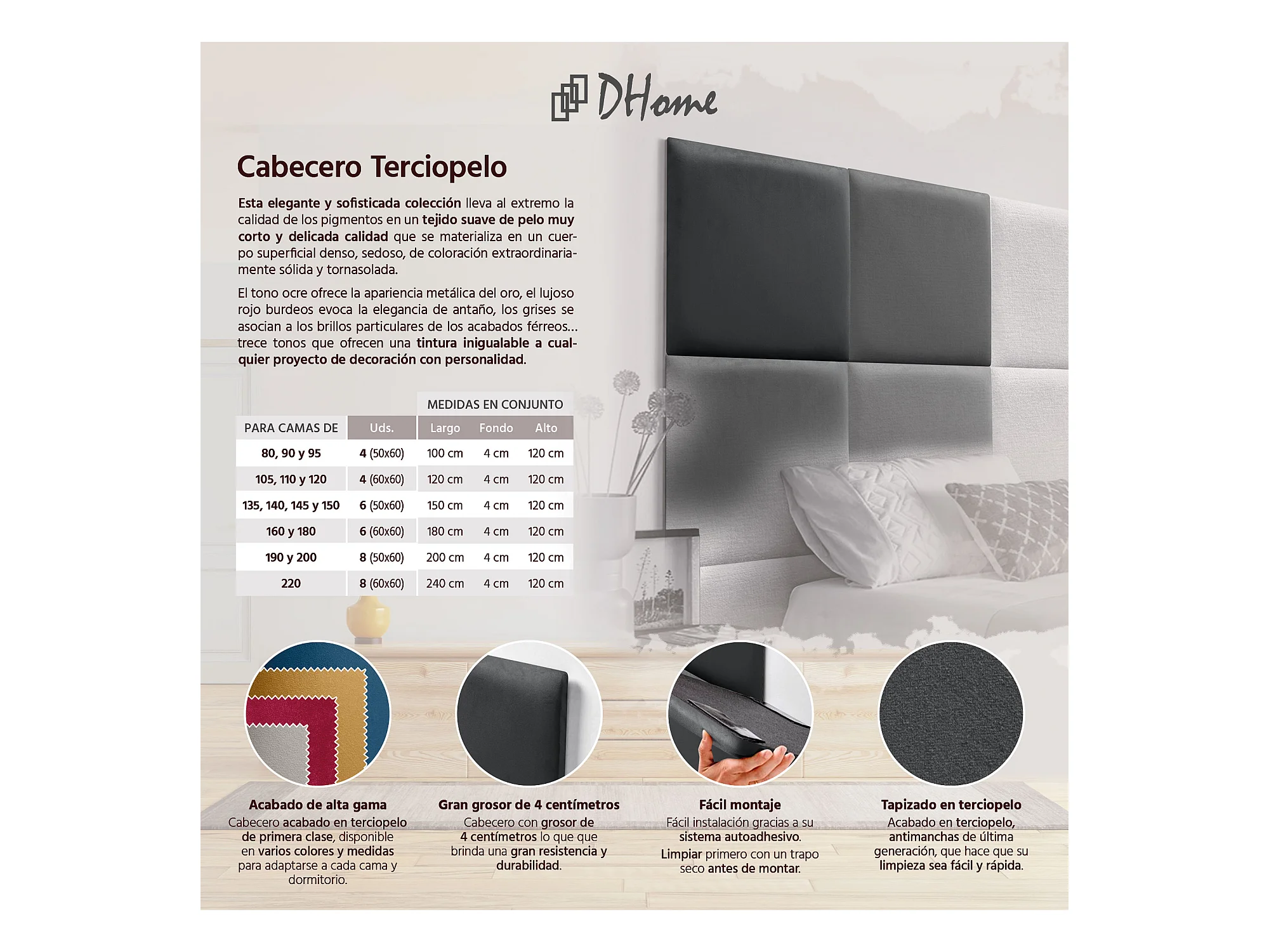 DHOME Premium-Samt-gepolstertes Kopfteil, bestehend aus austauschbaren selbstklebenden Paneelen, luxuriöses gepolstertes Schlafzimmer (Dunkelgrau, 220 cm)