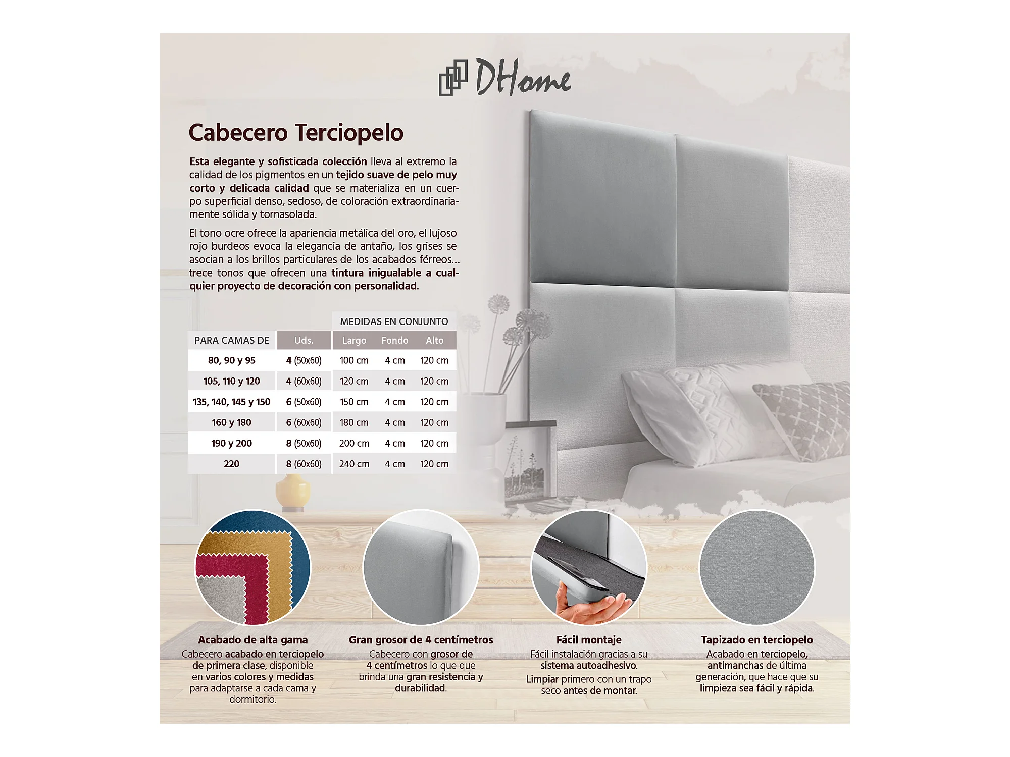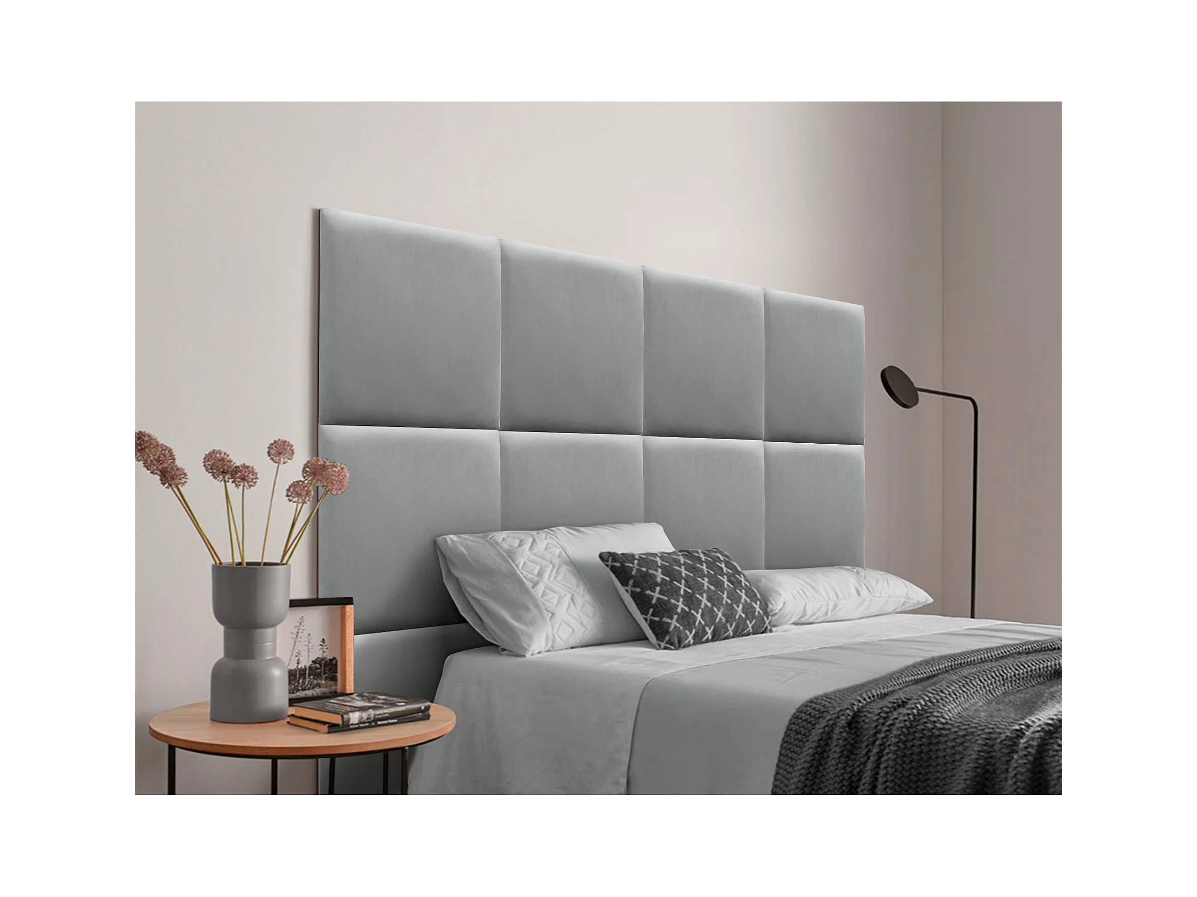 DHOME Premium-Samt-gepolstertes Kopfteil, bestehend aus austauschbaren selbstklebenden Paneelen, luxuriöses gepolstertes Schlafzimmer (Hellgrau, 110 cm)