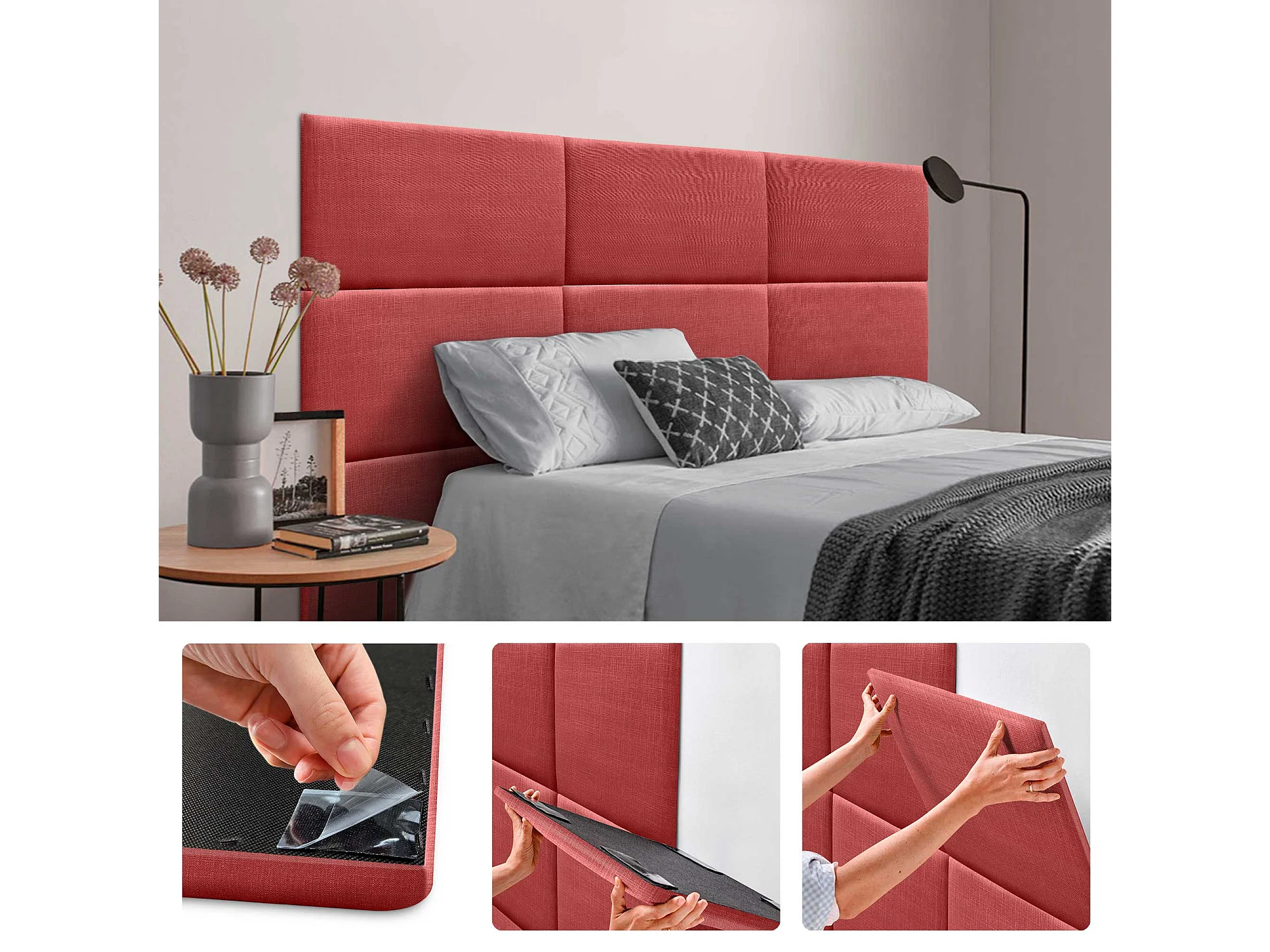 DHOME Set aus 1 mit Leinen gepolsterten selbstklebenden Paneel für Wände - Schallabsorbierend, Stoßschutz, Kopfteil-Dekoration (Rot, 50x30cm, x1)
