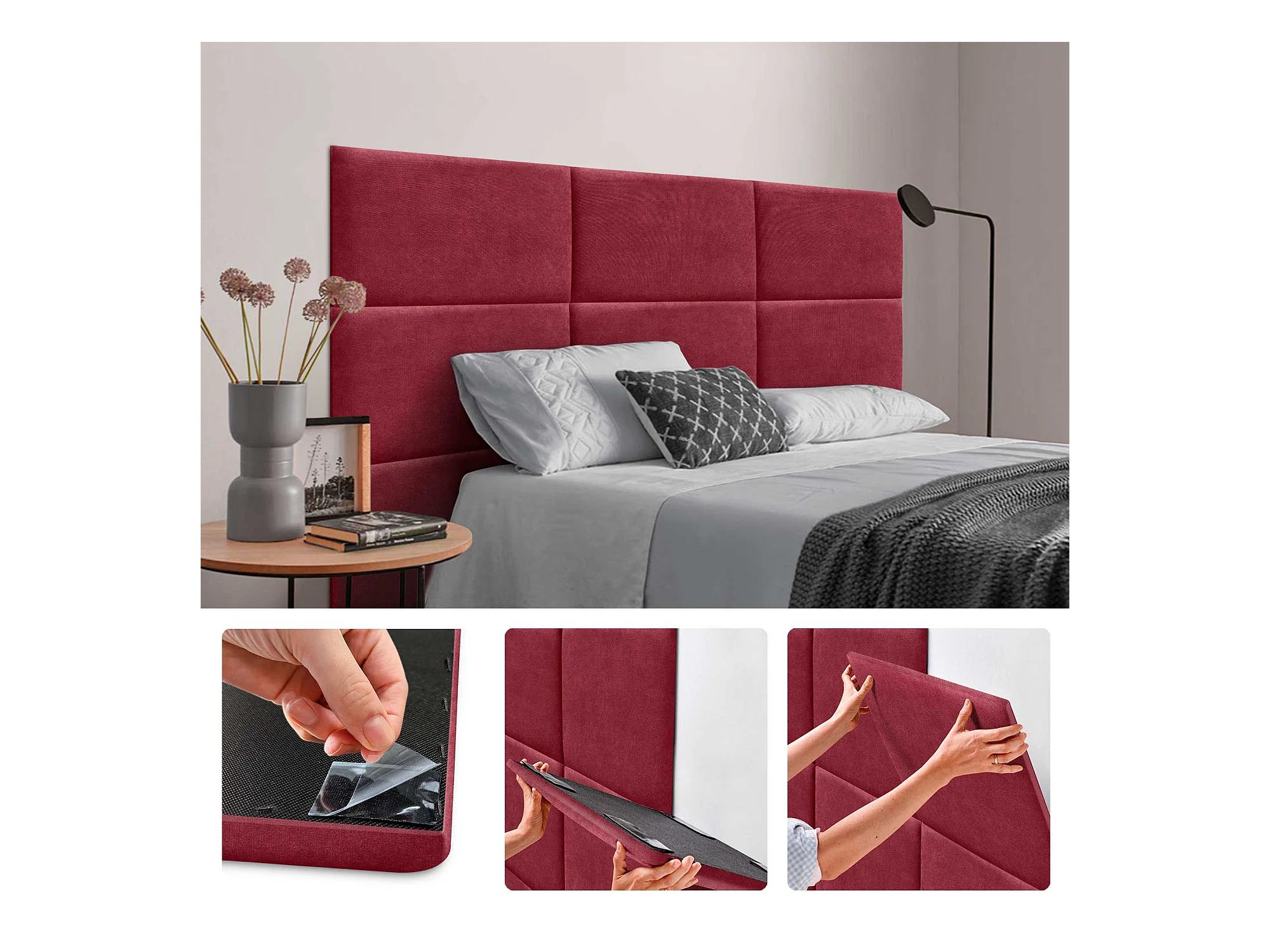 DHOME Set aus 1 selbstklebendem, gepolstertem Stoffpaneel für Wand, schallabsorbierend, Stoßschutz, Kopfteil (Rot, 50x40cm, x1)