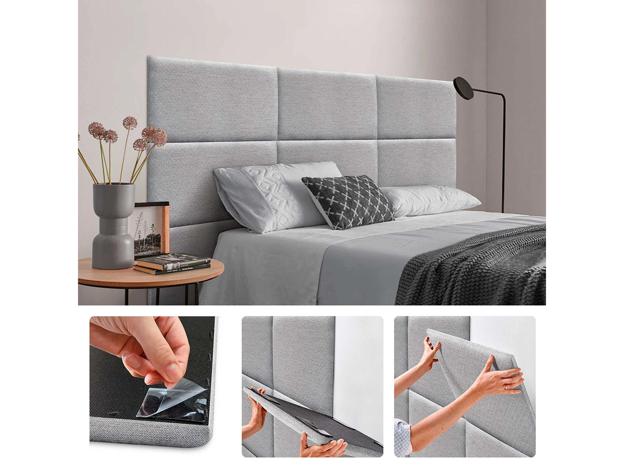 DHOME Set aus 6 luxuriös gepolsterte Paneele aus Stoff, Selbstklebende Akustik-Wandpaneele, schallabsorbierend, schützend (Silver Grey, 50x40cm, x6)
