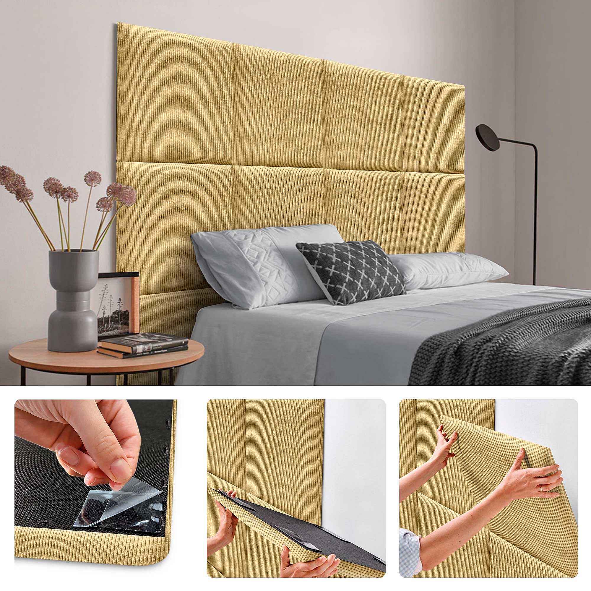 DHOME Set aus 8 gepolsterten Premium-Cord-Paneelen mit selbstklebender Rückseite für Wände – Akustisch absorbierend, Stoßschutz (Senfgelb, 60x60cm, x8)