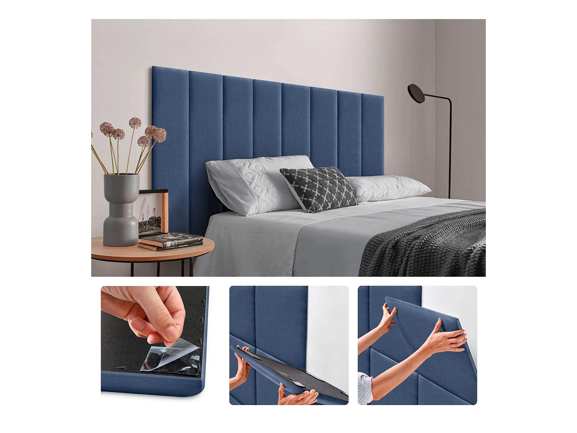 DHOME Set aus 8 mit Leinen gepolsterten selbstklebenden Paneelen für Wände - Schallabsorbierend, Stoßschutz, Kopfteil-Dekoration (Marineblau, 60x20cm, x8)