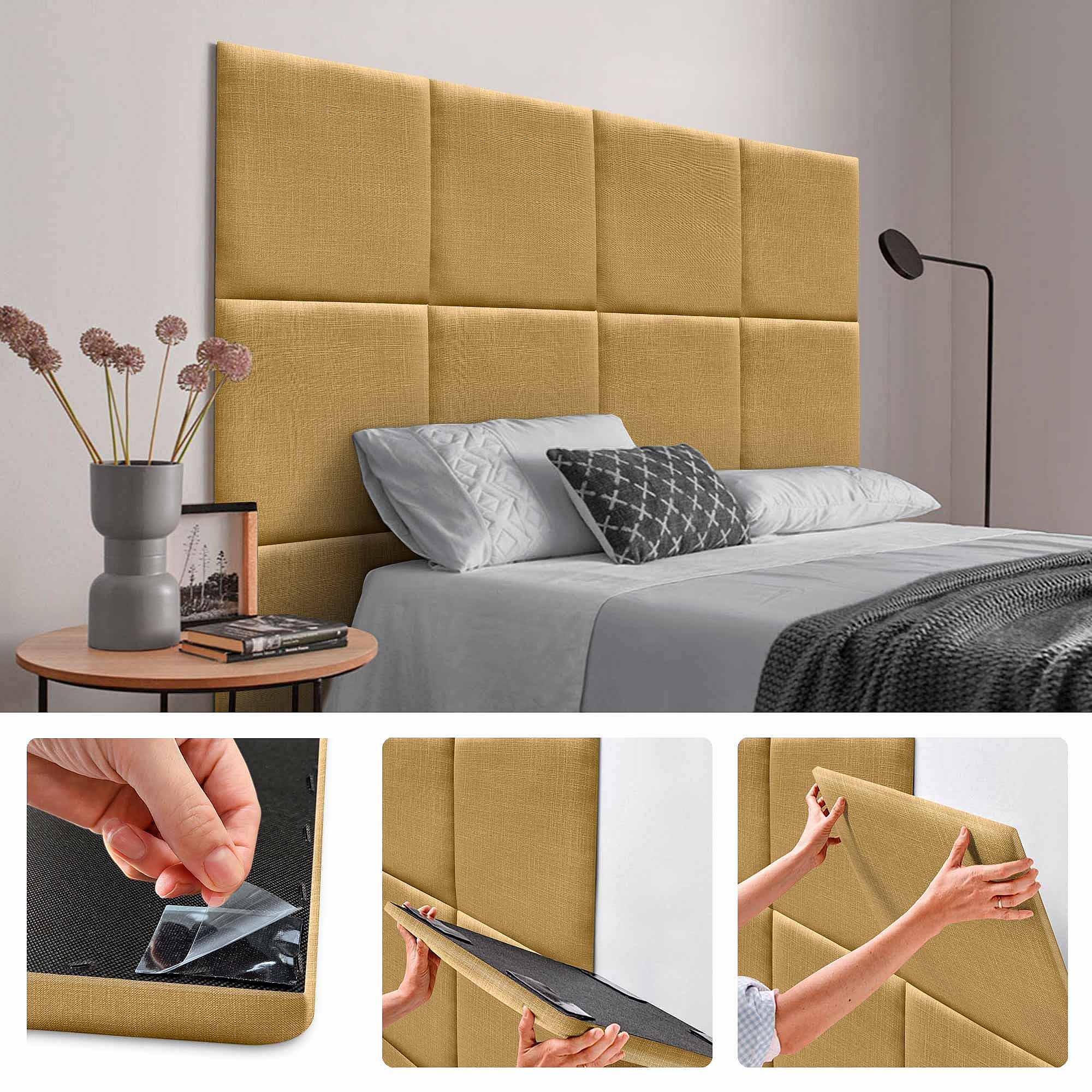 DHOME Set aus 8 mit Leinen gepolsterten selbstklebenden Paneelen für Wände - Schallabsorbierend, Stoßschutz, Kopfteil-Dekoration (Mostaza, 60x60cm, x8)