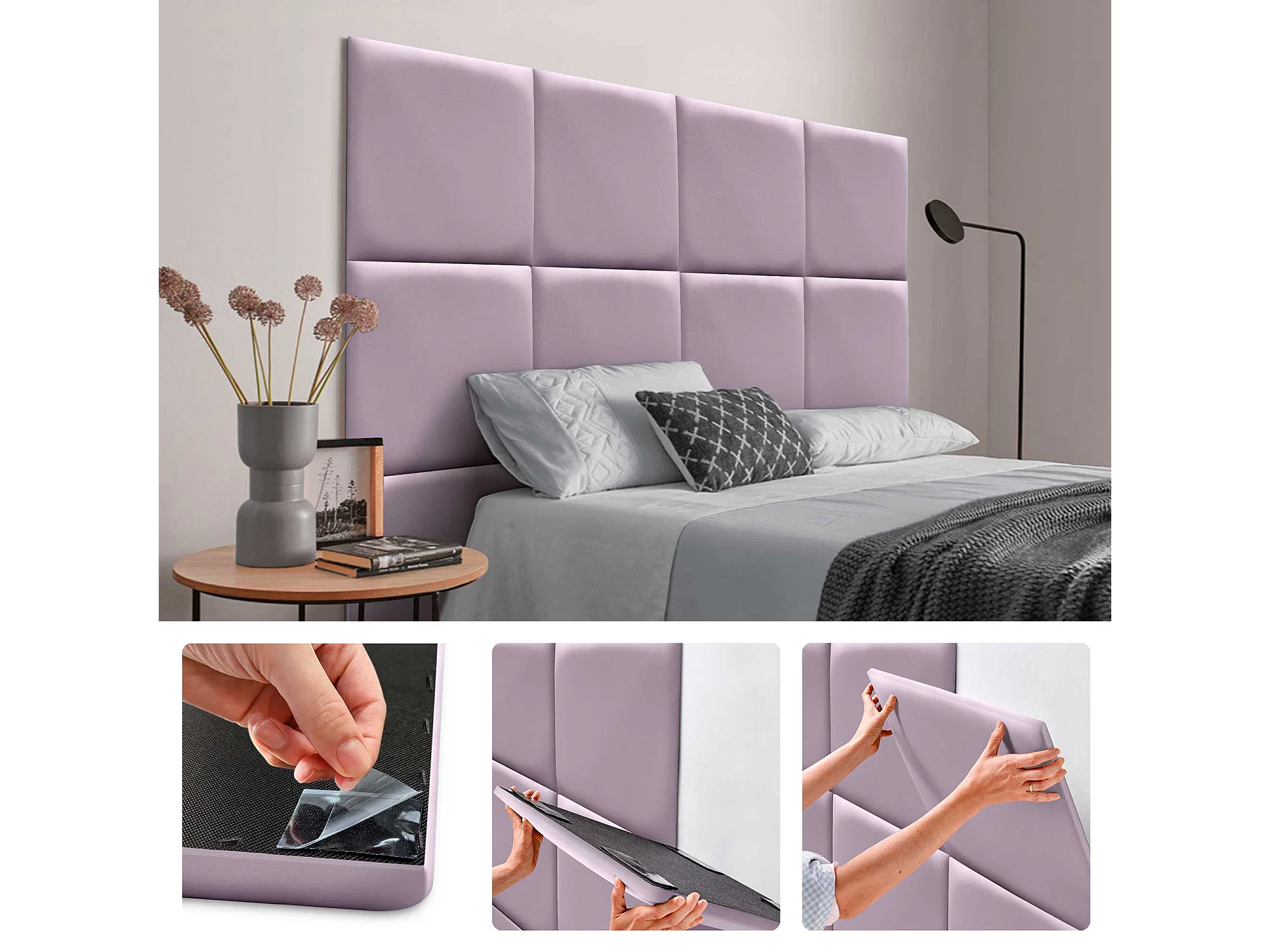 DHOME Set mit 6 umweltfreundlichen Kunstleder-Polsterplatten, selbstklebendes Paket für Wände, schallabsorbierender Schutz (Flieder, 60x60 cmx6)