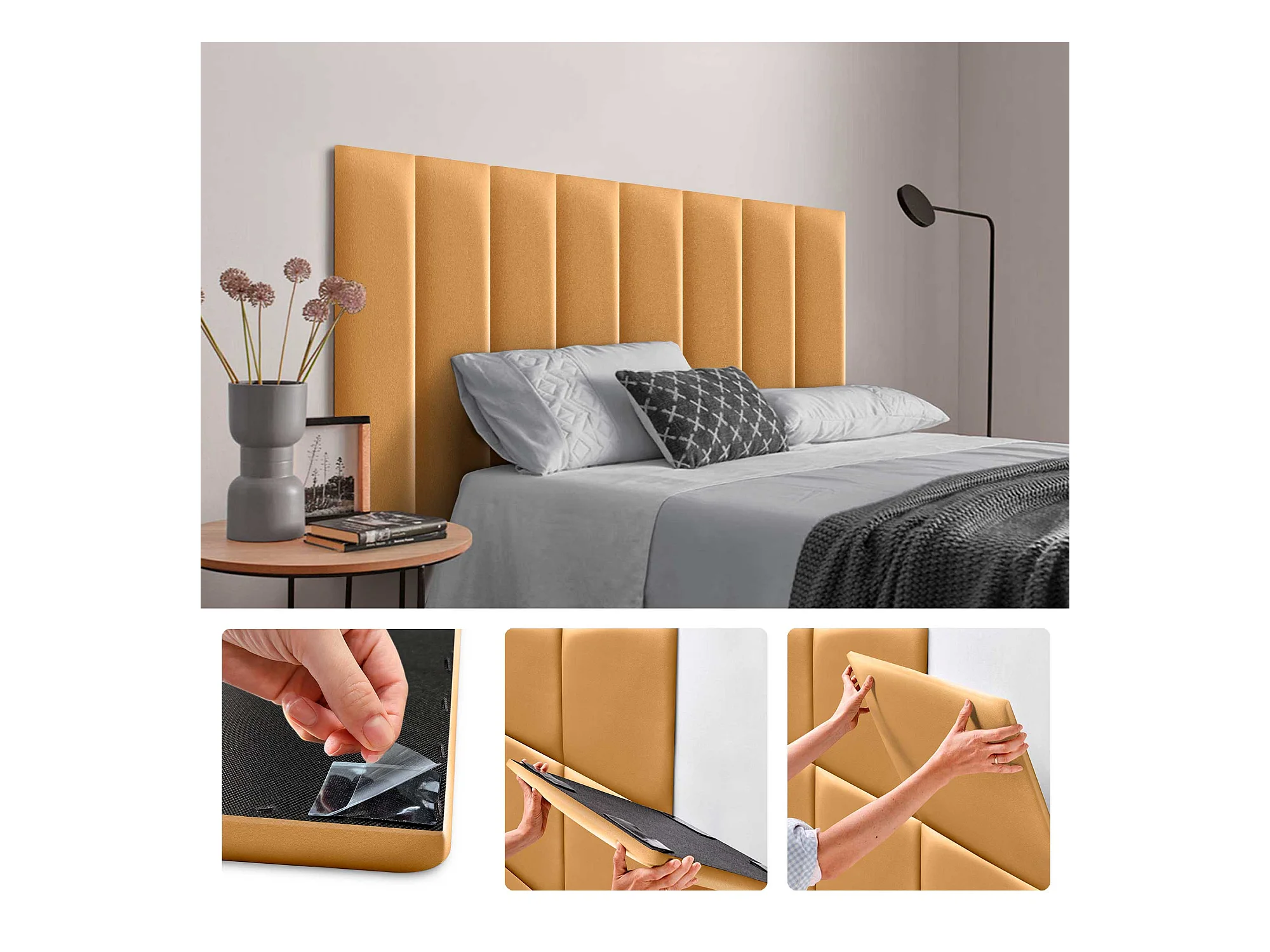 DHOME Set mit 6 umweltfreundlichen Kunstleder-Polsterplatten, selbstklebendes Paket für Wände, schallabsorbierender Schutz(Gold, 60 x 20 cm x 6)