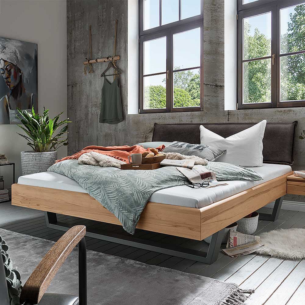Doppel Bett aus Kernbuche Massivholz und Metall Polster Kopfteil