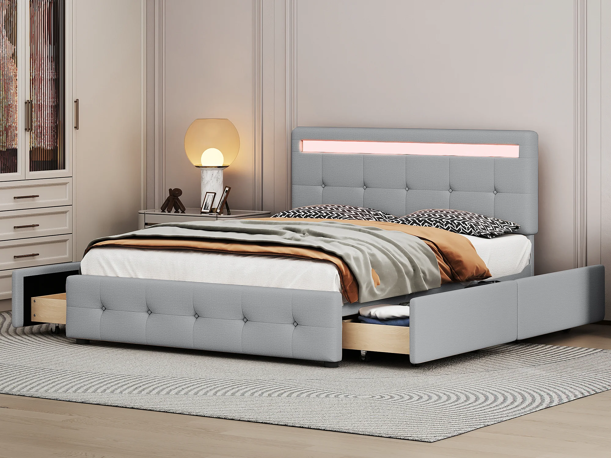 Doppelbett 140 x 200 cm mit Kopfteil und 4 Schubladen – LEDs – Leinenstoff – Grau