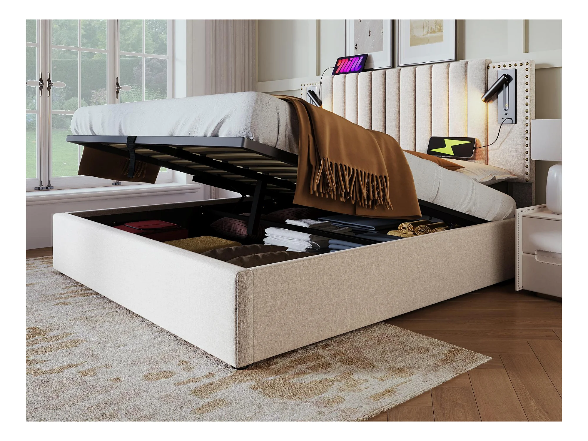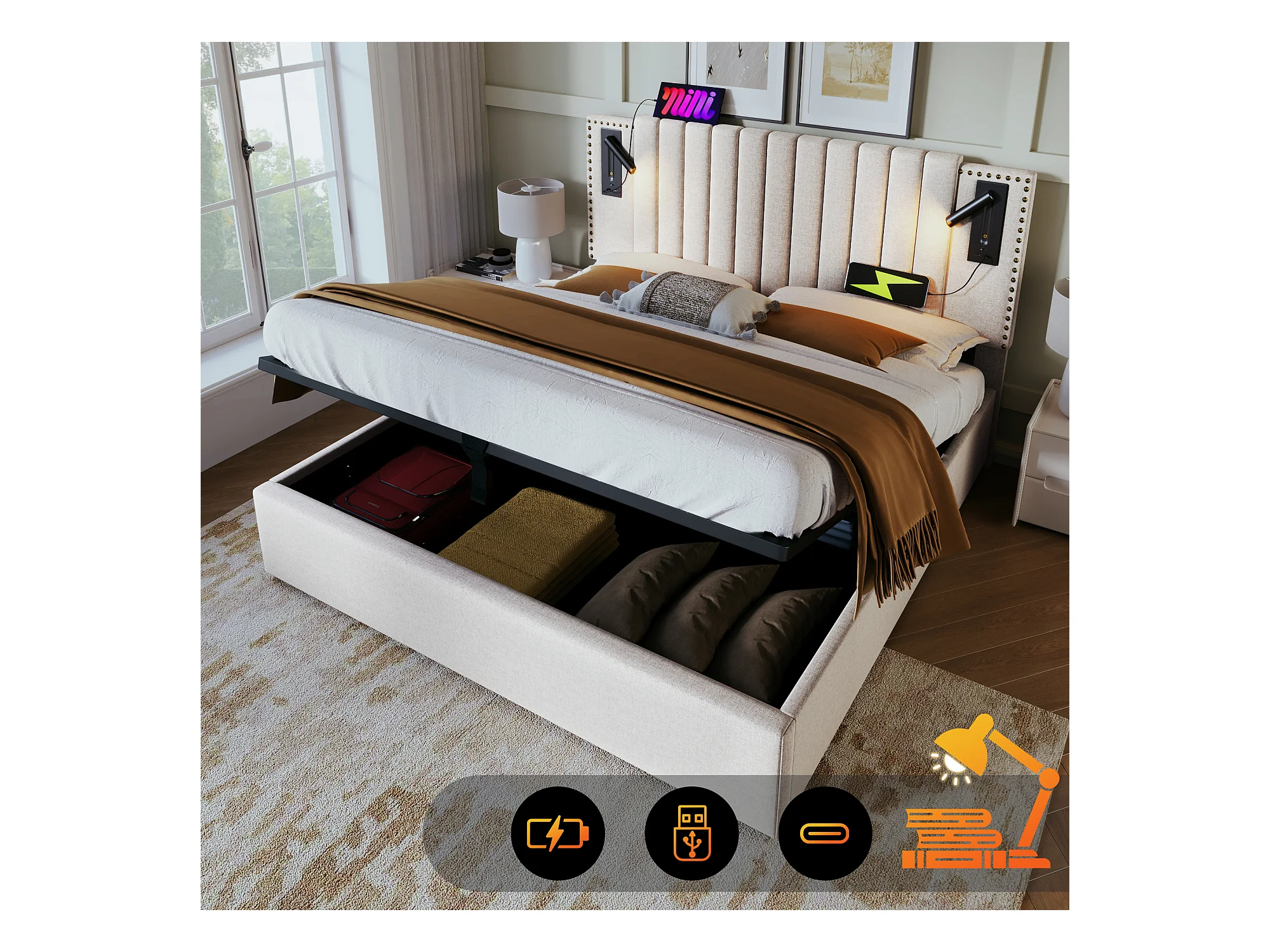160 x 200 cm großes Stauraumbett aus Baumwollstoff – mit Leselampen und USB-Ladeanschlüssen – mit Lattenrost – Beige