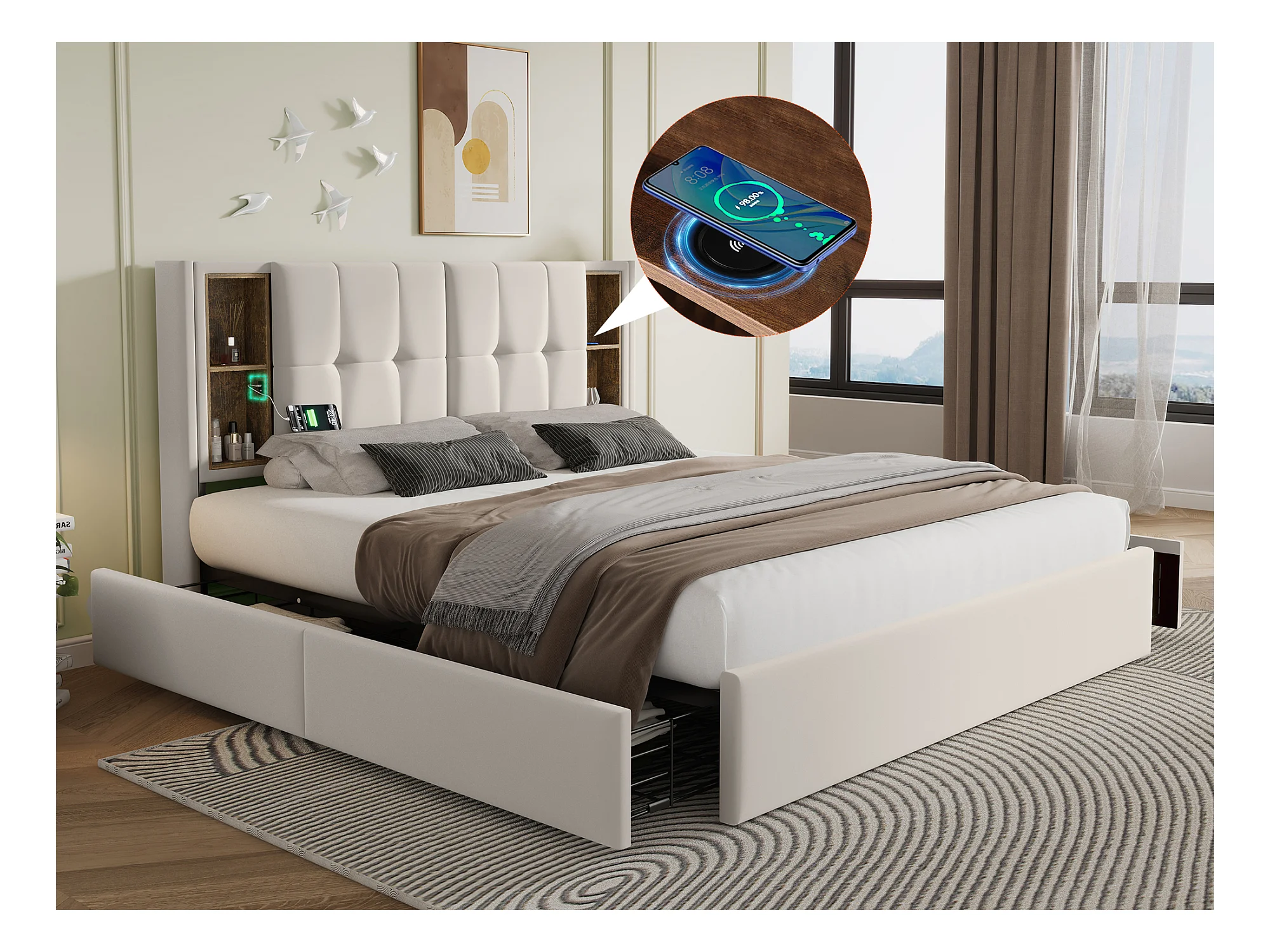 Doppelbett 160 x 200 cm mit kabellosem USB-C-Ladegerät und 4 Schubladen – Samt – Beige