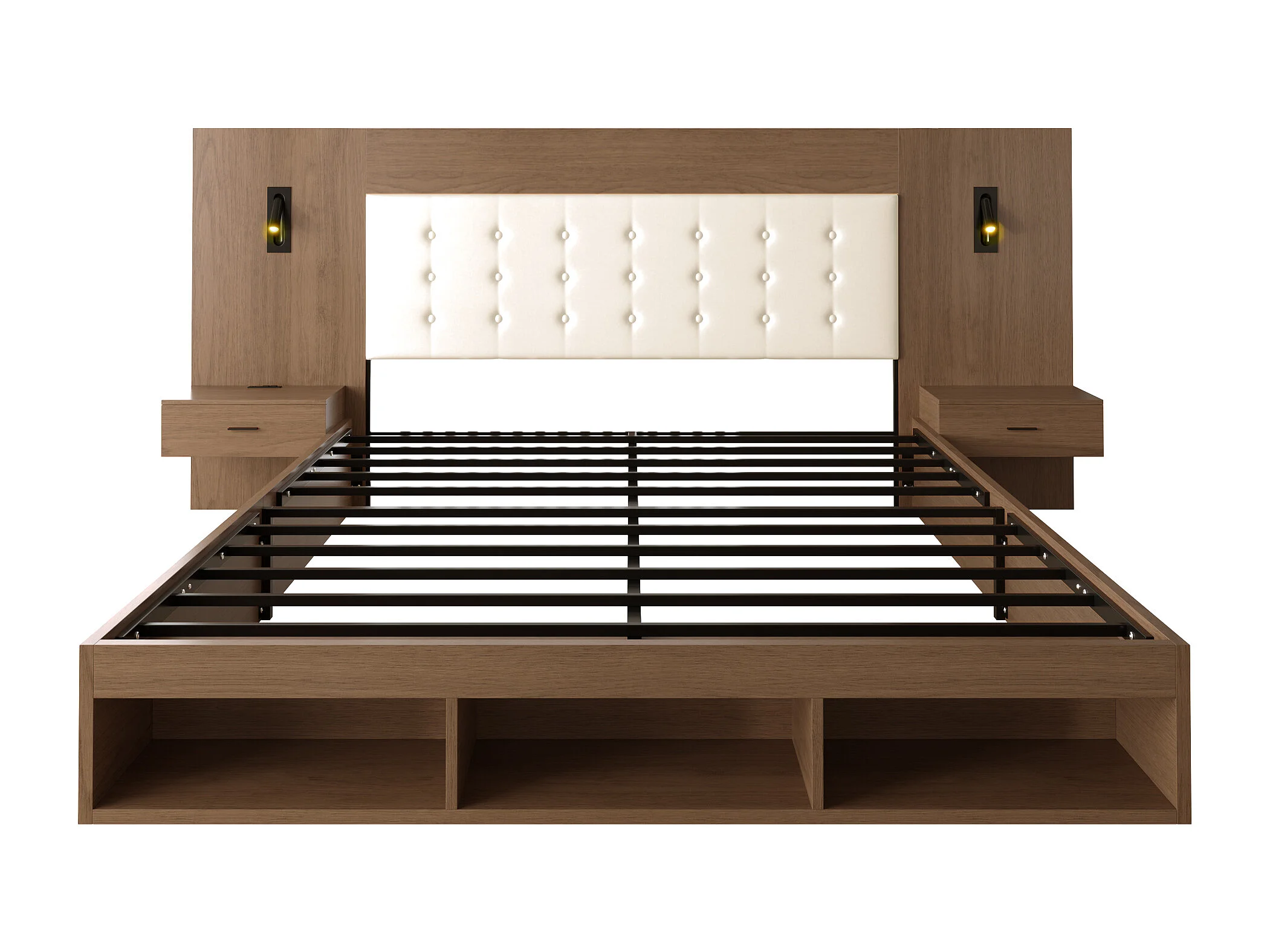 Doppelbett 180x200cm - mit 2 Nachttischen - USB- und Type-C-Anschlüssen - mit Leselampe - Braun​ (Matratze nicht inbegriffen)