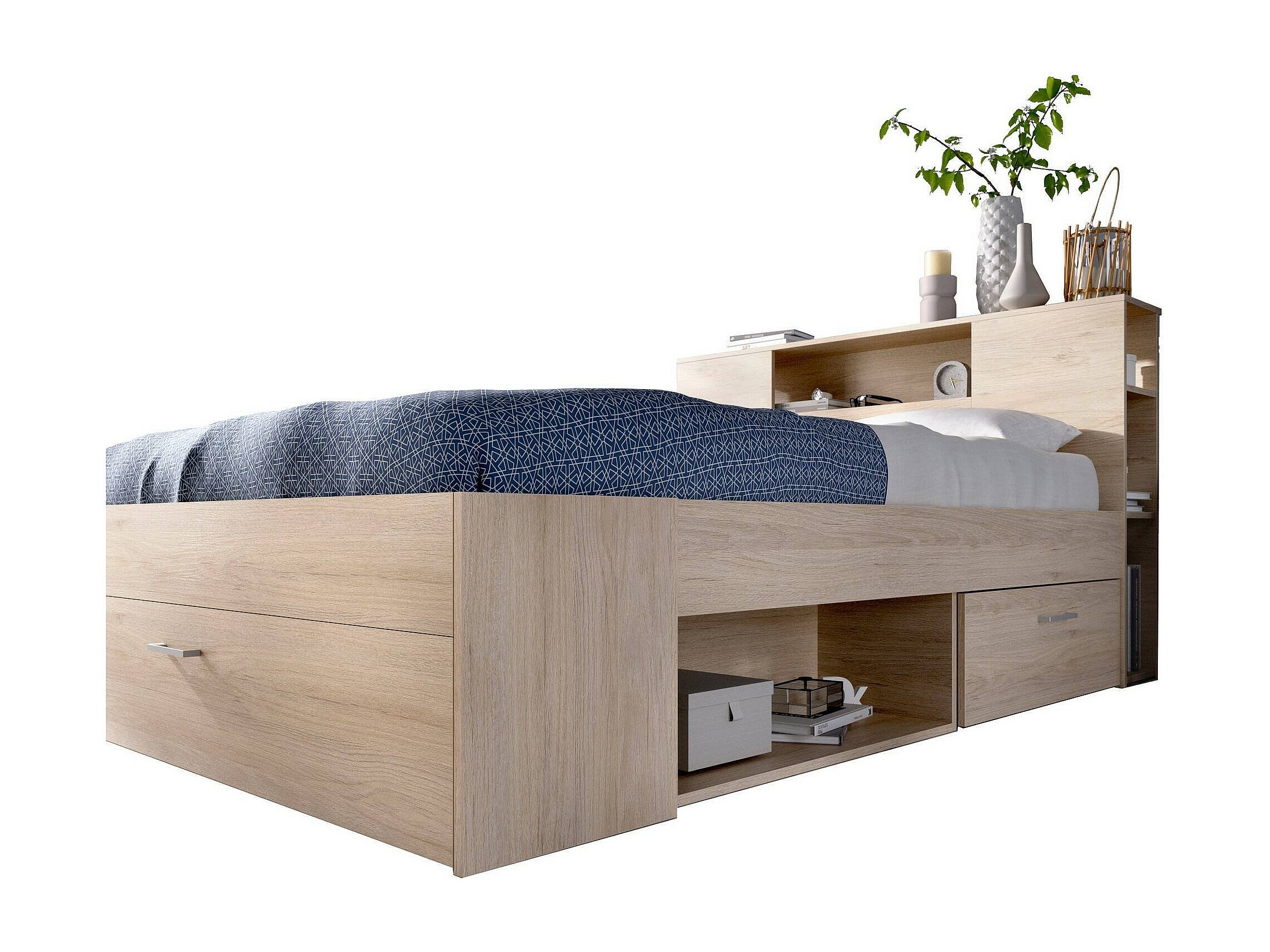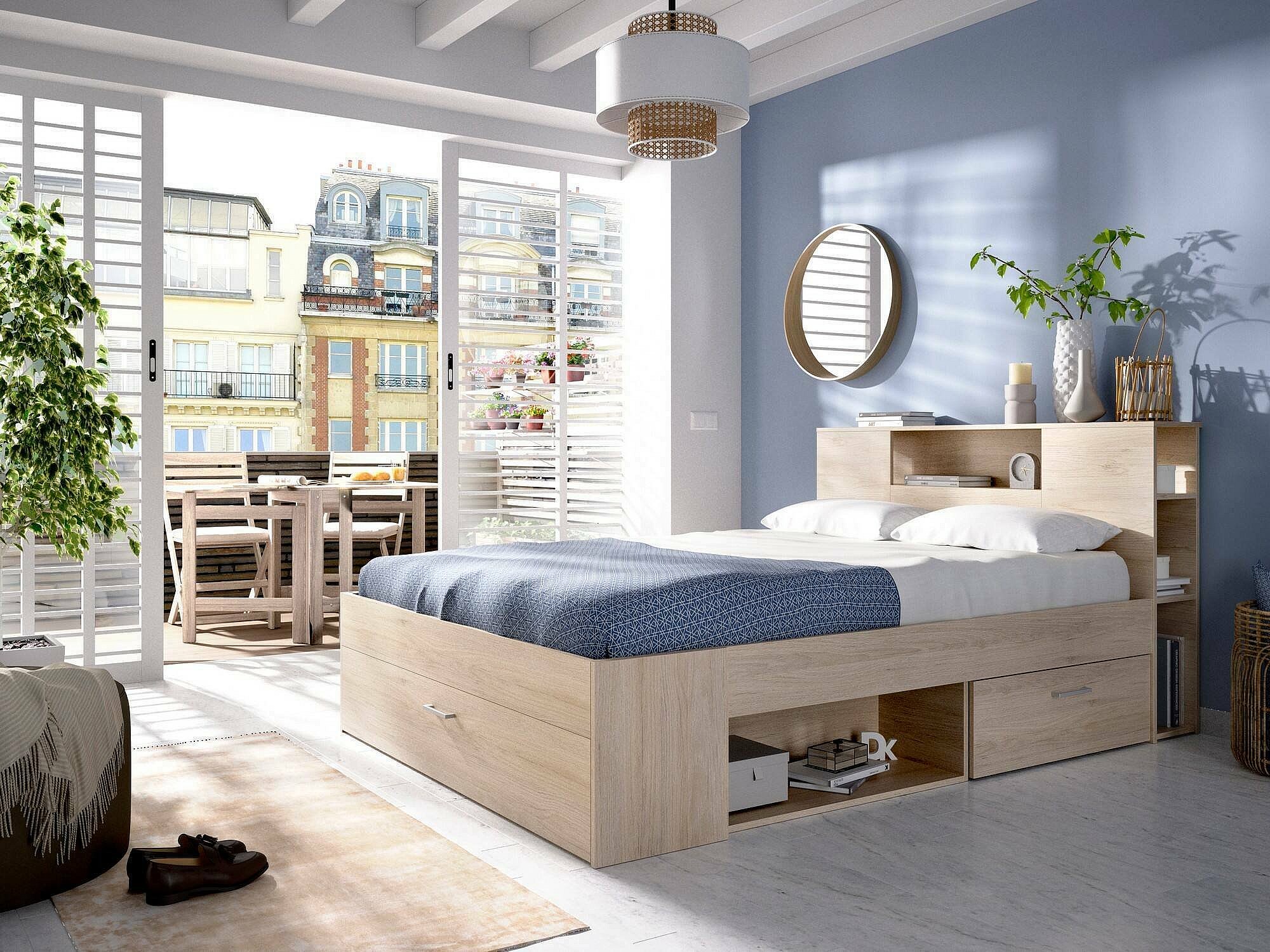 DOPPELBETT - Struktur des Container-Betts, Sommier mit Verkleidung, Matratzenhalterstruktur, 150x219 h95 cm, Eiche. STRUKTUR UND NUTZUNG - Die Struktur des Bettes ist widerstandsfähig und garantiert maximalen Komfort - Dank des hochwertigen Materials und der edlen Verarbeitung ideal, um eine ausgezeichnete und komfortable Nachtruhe zu gewährleisten - Moderne und innovative Struktur, perfekt für jede Art von Raum oder Schlafzimmer. QUALITÃ"T UND DESIGN - Modernes und elegantes Design-Möbelstück, perfekt für die Einrichtung einer zeitgemäßen und hellen Umgebung - Ideal für alle, die nach Funktionalität und platzsparenden Lösungen suchen, ist dieses Produkt perfekt für Häuser und Wohnungen aller Größen - Zwei Jahre Garantie ab Kaufdatum. TECHNISCHE EIGENSCHAFTEN ? Vielseitiges Einrichtungszubehör, konzipiert für die einfache Integration mit anderen Möbeln ? Widerstandsfähige Verpackung, konzipiert für den E-Commerce - Material: Melaminbeschichtete Platte 16mm, Melaminbeschichtete Platte 19mm - Zusätzliche Infos: Vollständig aus Melamin-Spanplatte gefertigt, einem Material, das stoß- und kratzfest, langlebig und wasserfest ist ? Kanten mit Melaminbeschichtung ? Klassifizierung nach Gehalt oder Freisetzung von Formaldehyd TYP E1 ? Einfache und schnelle Montage: Dank der mitgelieferten Montagewerkzeuge Zusammen mit dem Produkt und der Bedienungsanleitung können Sie Ihr Produkt in wenigen Minuten zusammenbauen ? Mit fünf offenen Fächern, einer Schublade und einem Fach mit Klapptür ? Griffe im Lieferumfang enthalten ? Geeignet für eine 190 x 90 cm große Matratze und Untergestell ? Matratze nicht im Lieferumfang enthalten ? Bettgestell mit Eckstützen aus Metall zum Aufstellen des Bettgestells ausgestattet - Untergestell mit Metallprofil erforderlich, nicht im Lieferumfang enthalten - Maximales Stützgewicht des Bettes: 75 kg - Maximales Stützgewicht pro Schublade: 10 kg. ABMESSUNGEN IN CM - Doppelbett : Länge: 149,6 Breite: 218,5 Höhe: 95