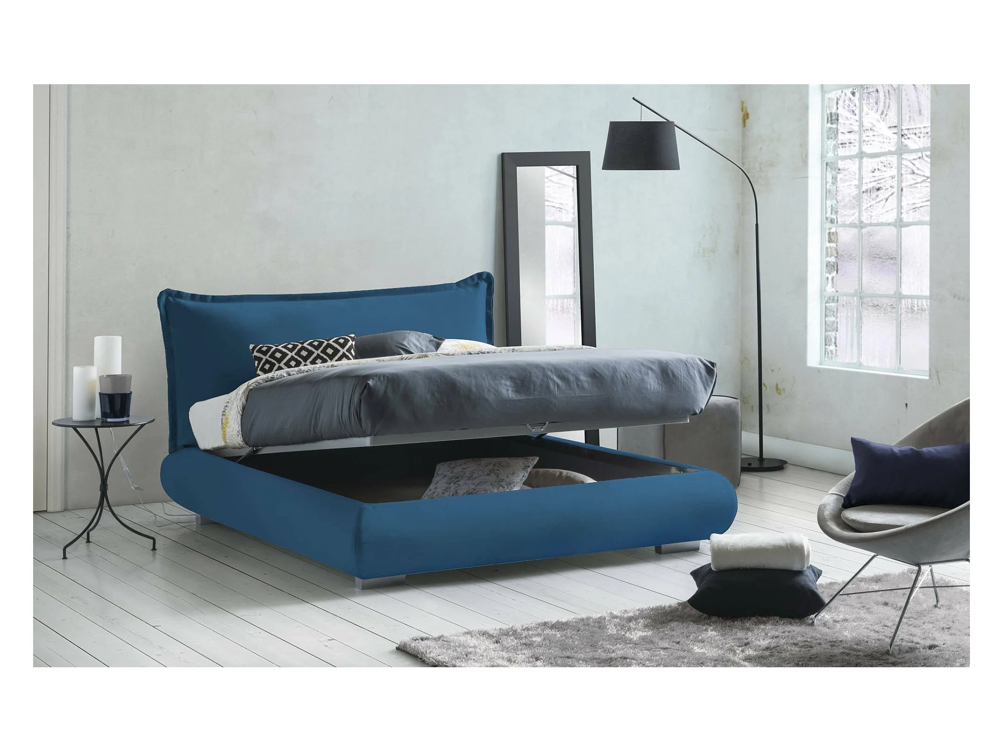 Doppelbett Ilenia, Bettkasten mit Stoffbezug und Kopfteil, 100 % Made in Italy, Öffnung vorne, geeignet für Matratzen 160 x 190 cm, Blau