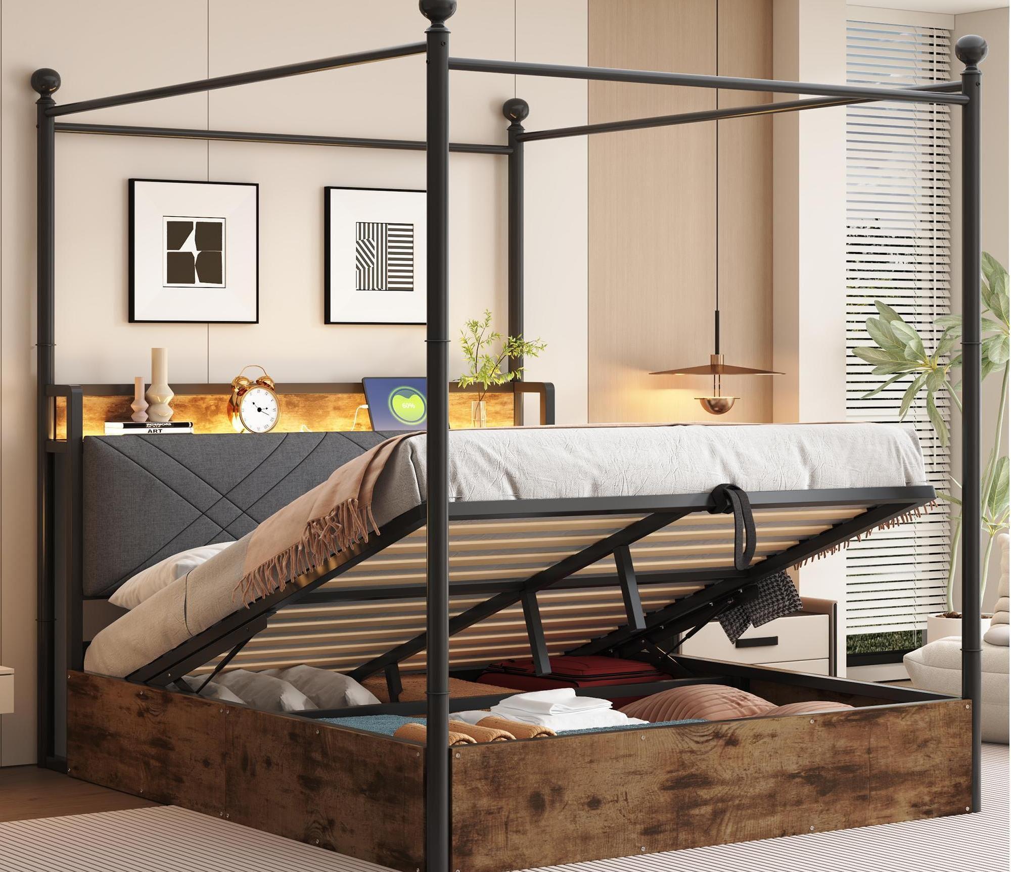 Doppelbett mit Kasten 140x190 cm - mit Metall-Baldachin - Abnehmbare Bettpfosten - mit LED und USB/Type-C-Anschluss - Schwarz
