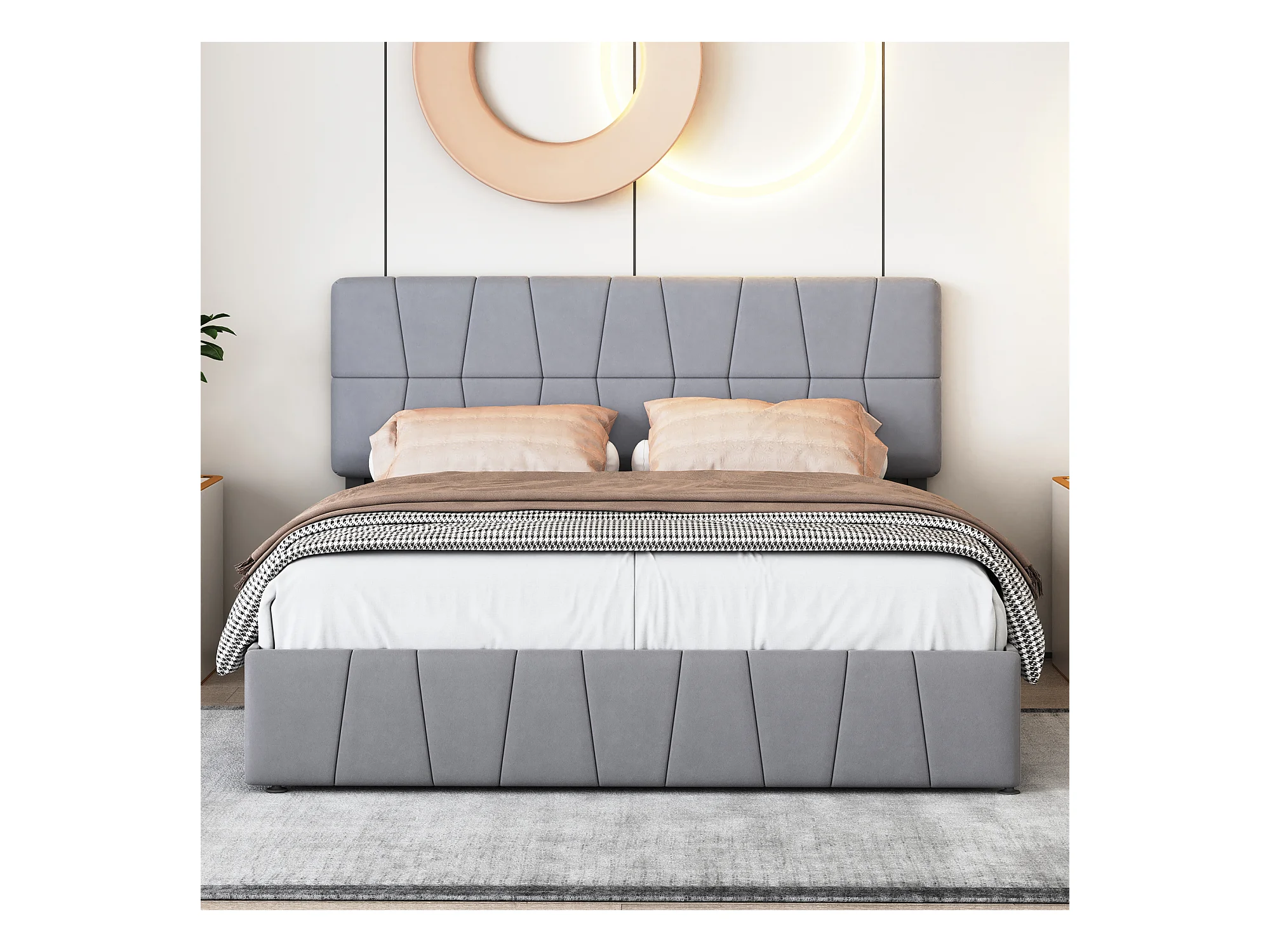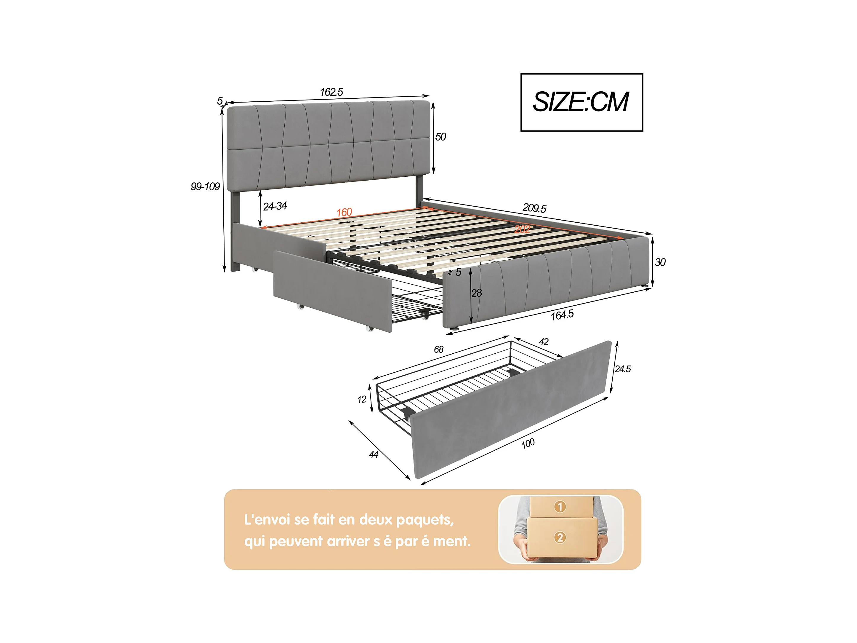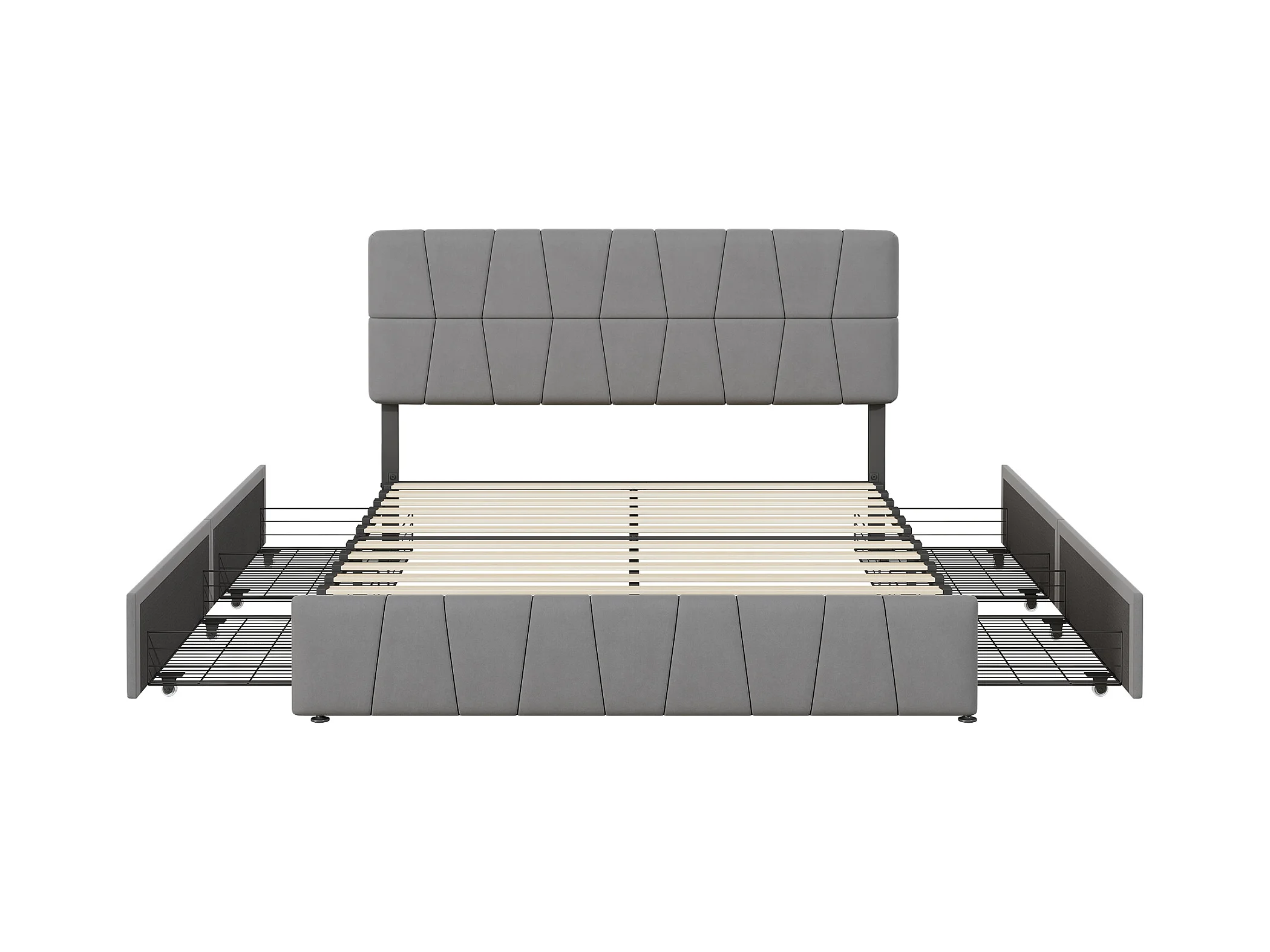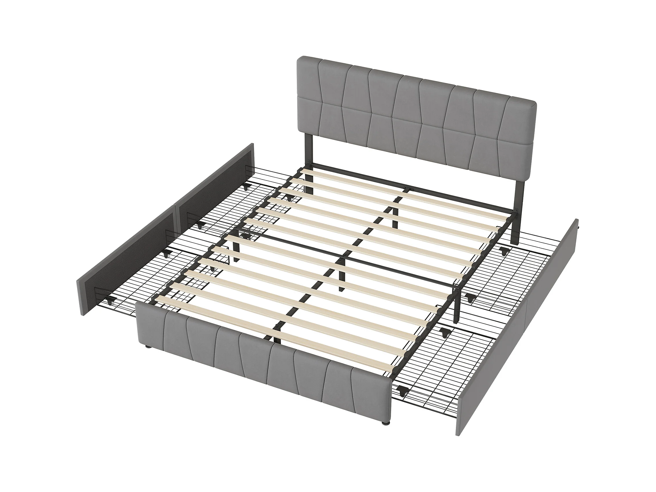 Doppelbett mit Samtbezug und 4 Schubladen – 160 x 200 cm – Lattenrost mit höhenverstellbarem Kopfteil und Lattenrost – Grau