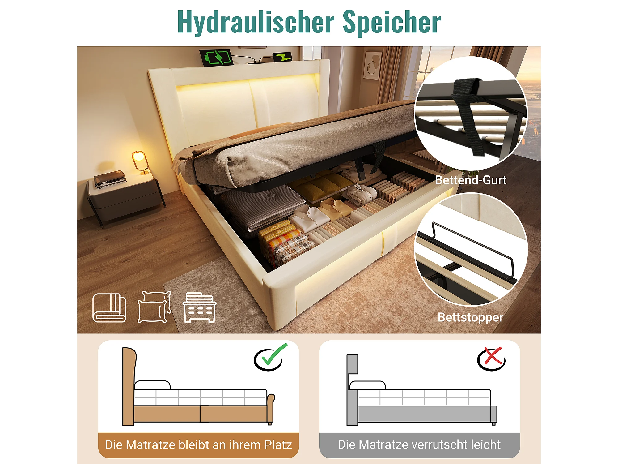 Doppelbett mit Stauraum - 160 x 200 cm - mit hydraulischem Lattenrost + LEDs + USB + gebogenem Kopfteil - Samt - beige (mit Matratze)