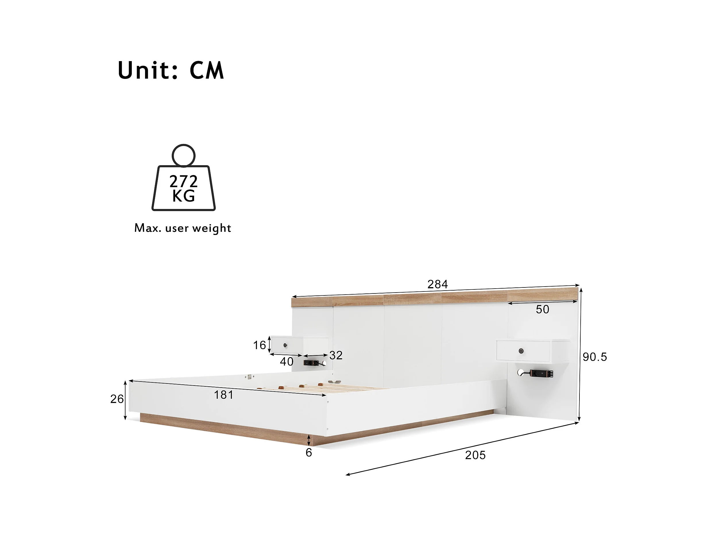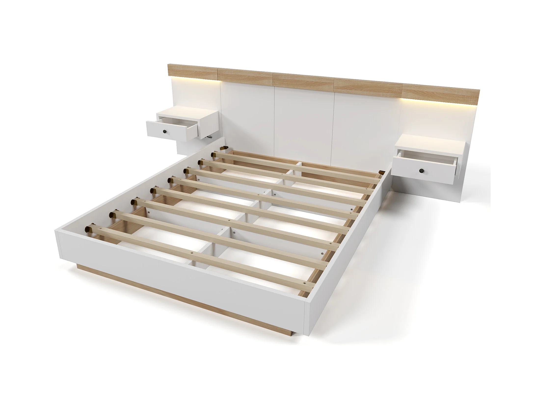 Doppelbett-Set mit 2 LED-Nachttischen und USB-C-Anschluss. Holzbett 180 x 200 cm.