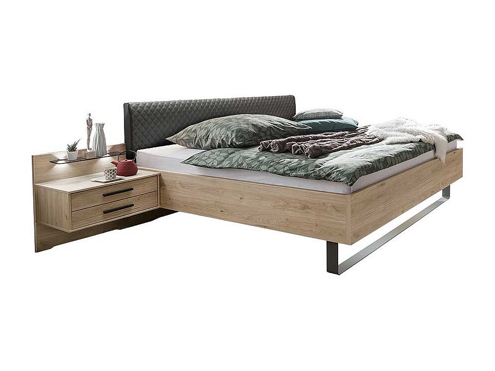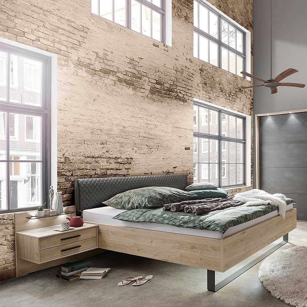Doppelbettgestell in Eiche Optik und Dunkelgrau gepolstertem Kopfteil (dreiteilig)