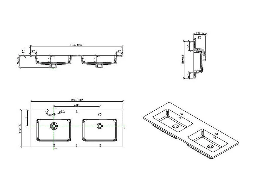 Doppelwaschtisch + Unterschrank 120 cm montiert VERONA Eiche hell