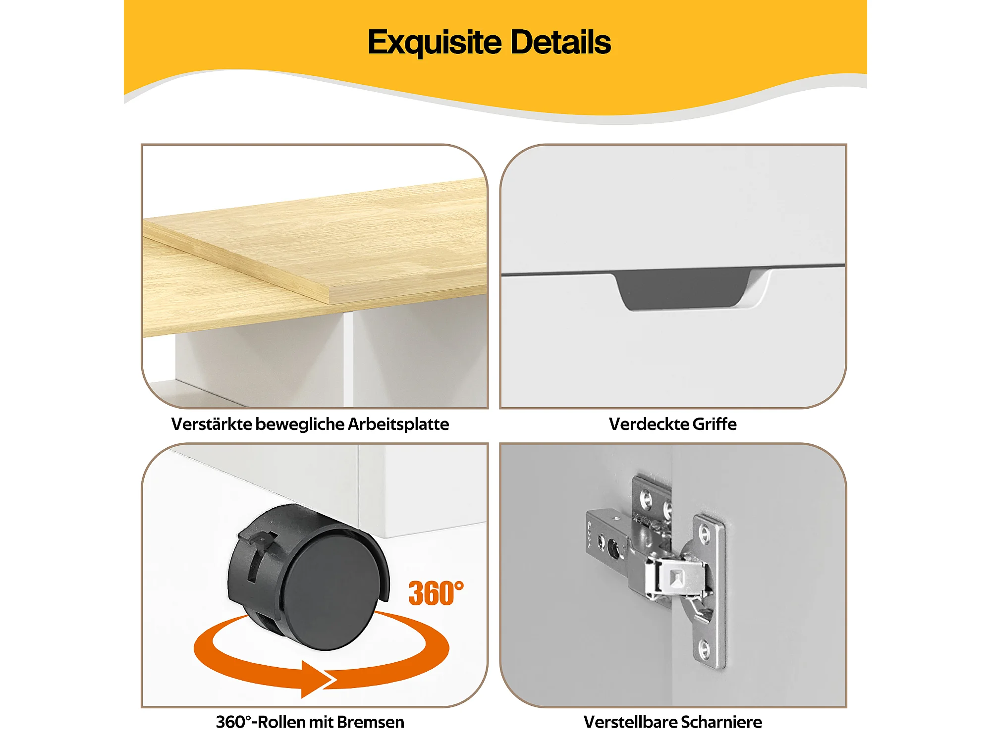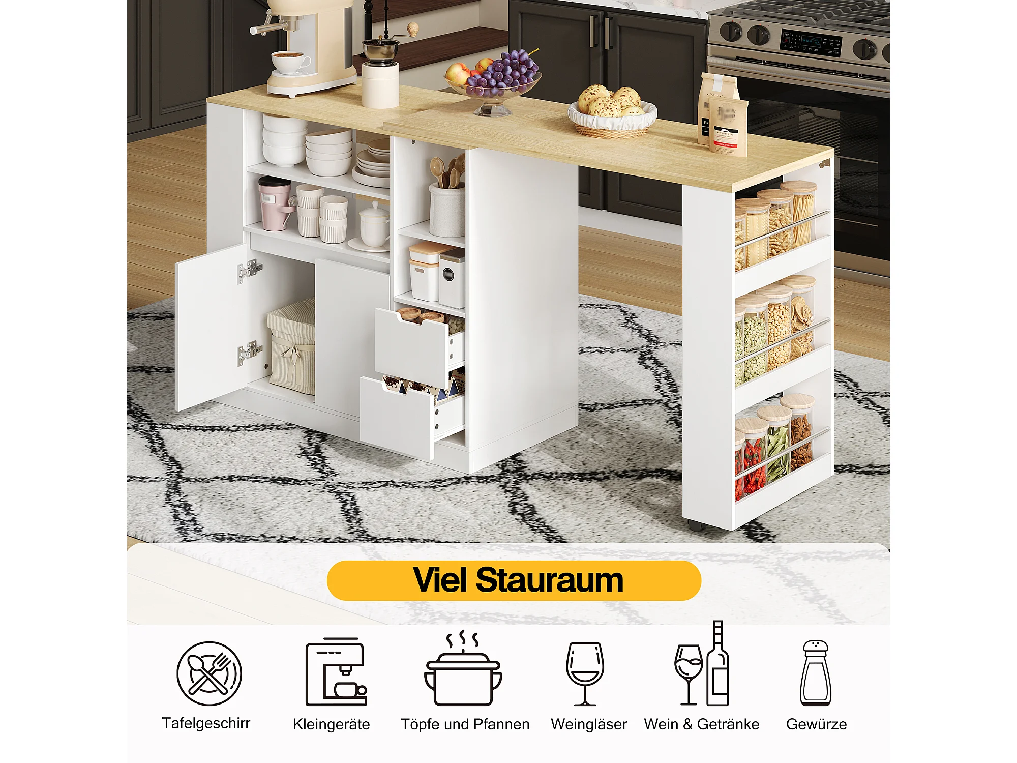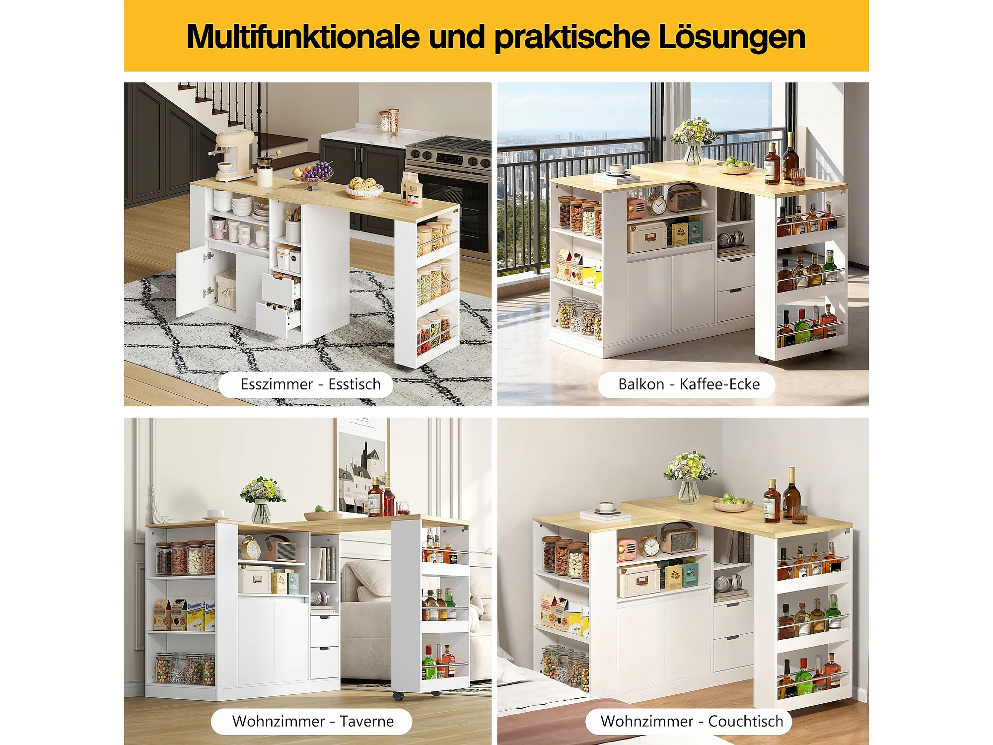 Drehbarer Barschrank – 115 x 50 x 92 cm – mit Regalböden, 2 Schubladen und ausziehbarem Tisch – MDF – weiß + natur