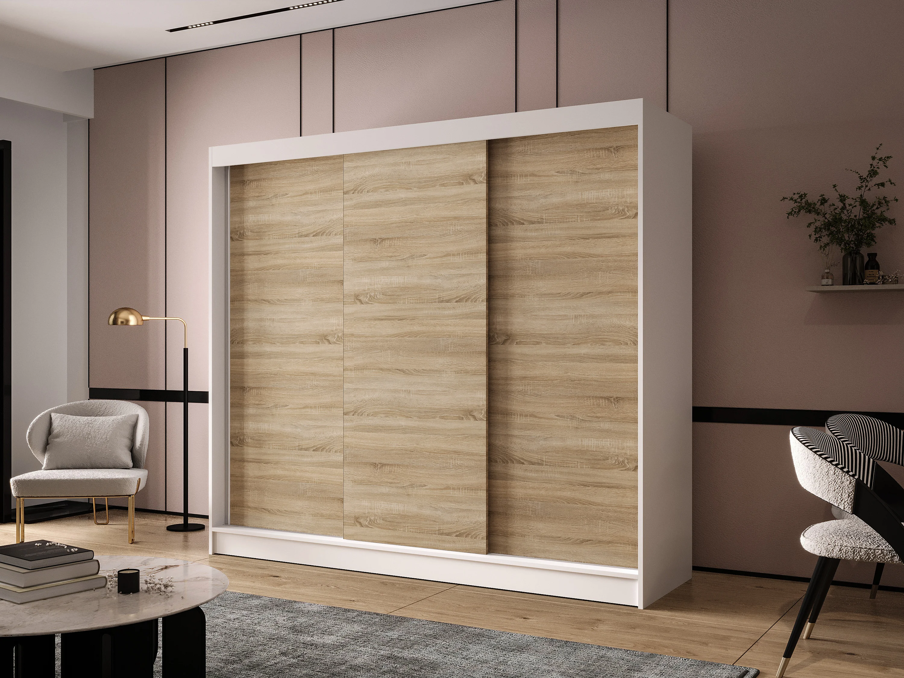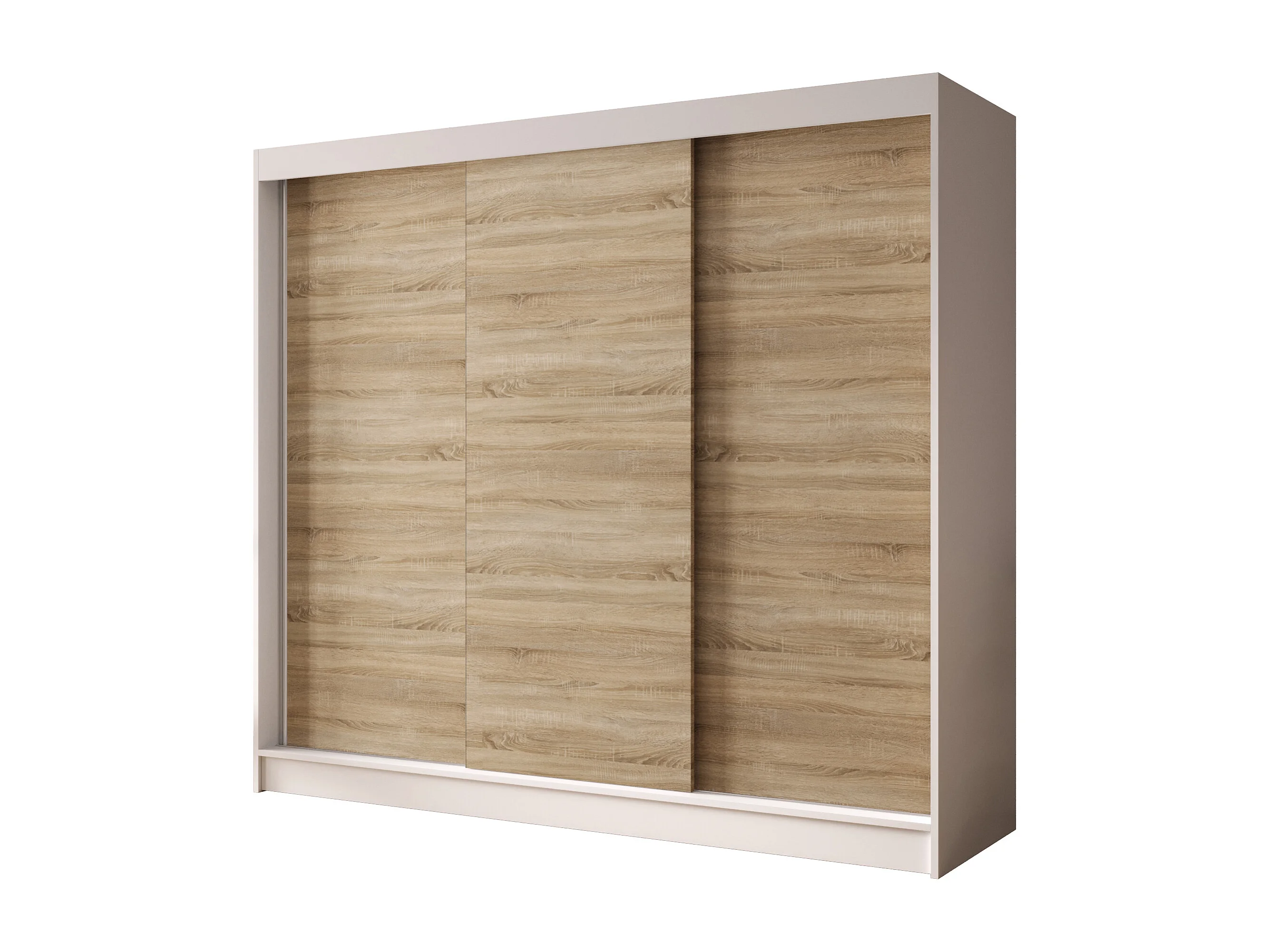 Dreitüriger Schiebeschrank DALLAS DY2, Regalböden und Kleiderstange (Weiß/Sonoma)